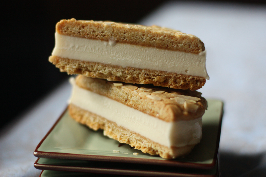 Maak een ijsssandwich met koekjes, wafels of macarons (!) met daartussen een bolletje ijs.