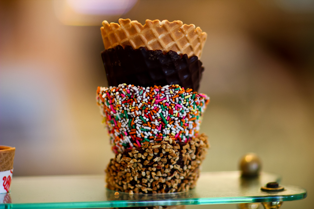 Koop kant-en-klare ijshoorntjes (bij de supermarkt, ijssalon of groothandel), dip ze in getemperde chocolade en versier met sprinkles en discodip.
