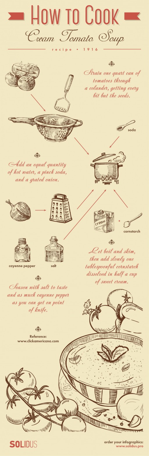 Dit recept voor romige tomatensoep stamt uit 1916. Bijna honderd jaar geleden maakten ze deze klassieke soep met (uiteraard) tomaten, een snufje soda, een geraspte ui, maïzena, slagroom, cayennepeper en zout.