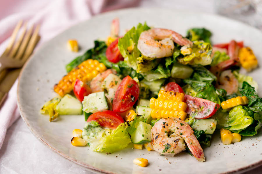 Maaltijdsalade met gegrilde sla, garnalen en maiskolven
