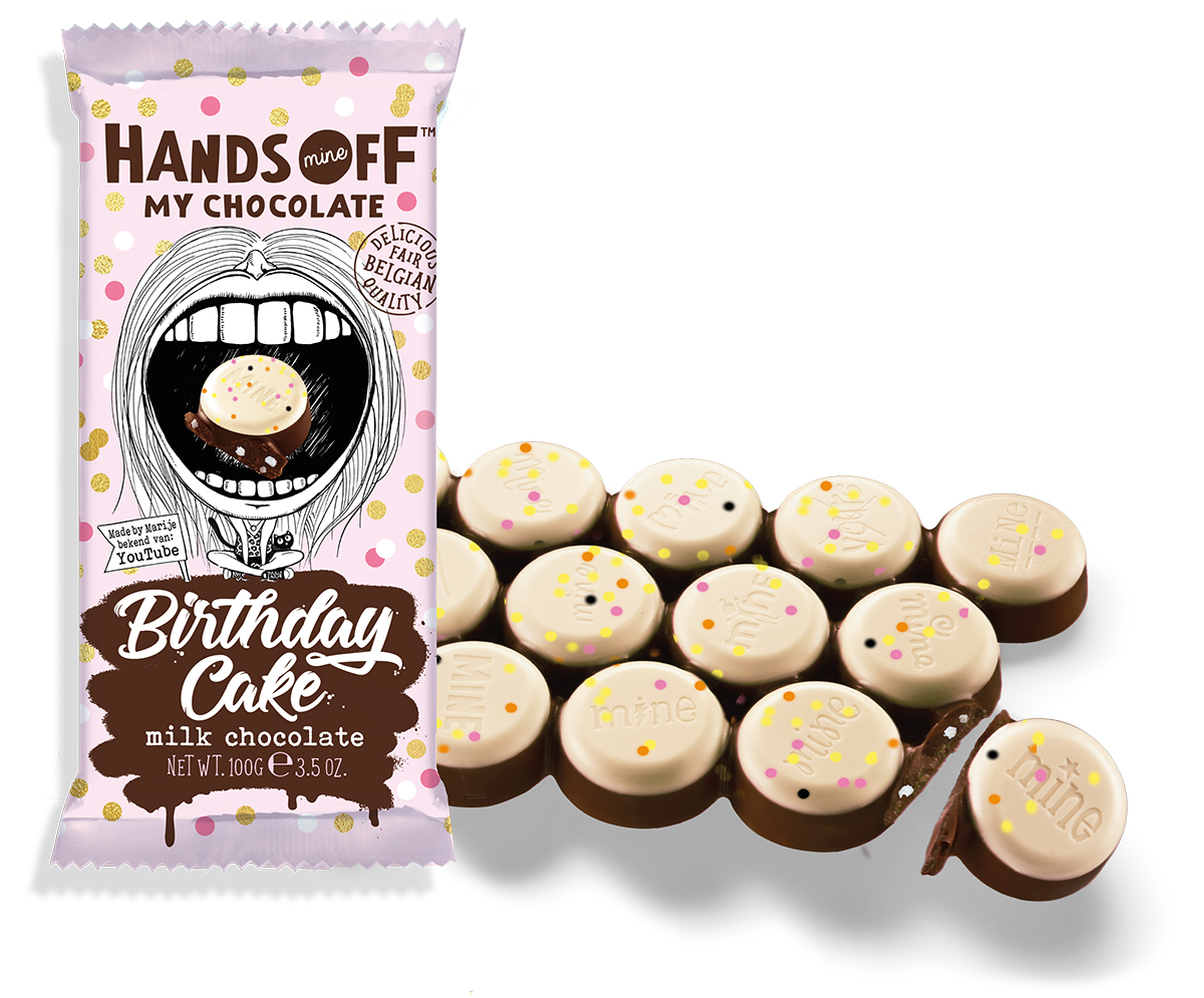 De Birthday Cake-reep van Hands Off My Chocolate is vanaf vandaag een jaar lang te koop in de supermarkten en via de webshop voor € 2,05.