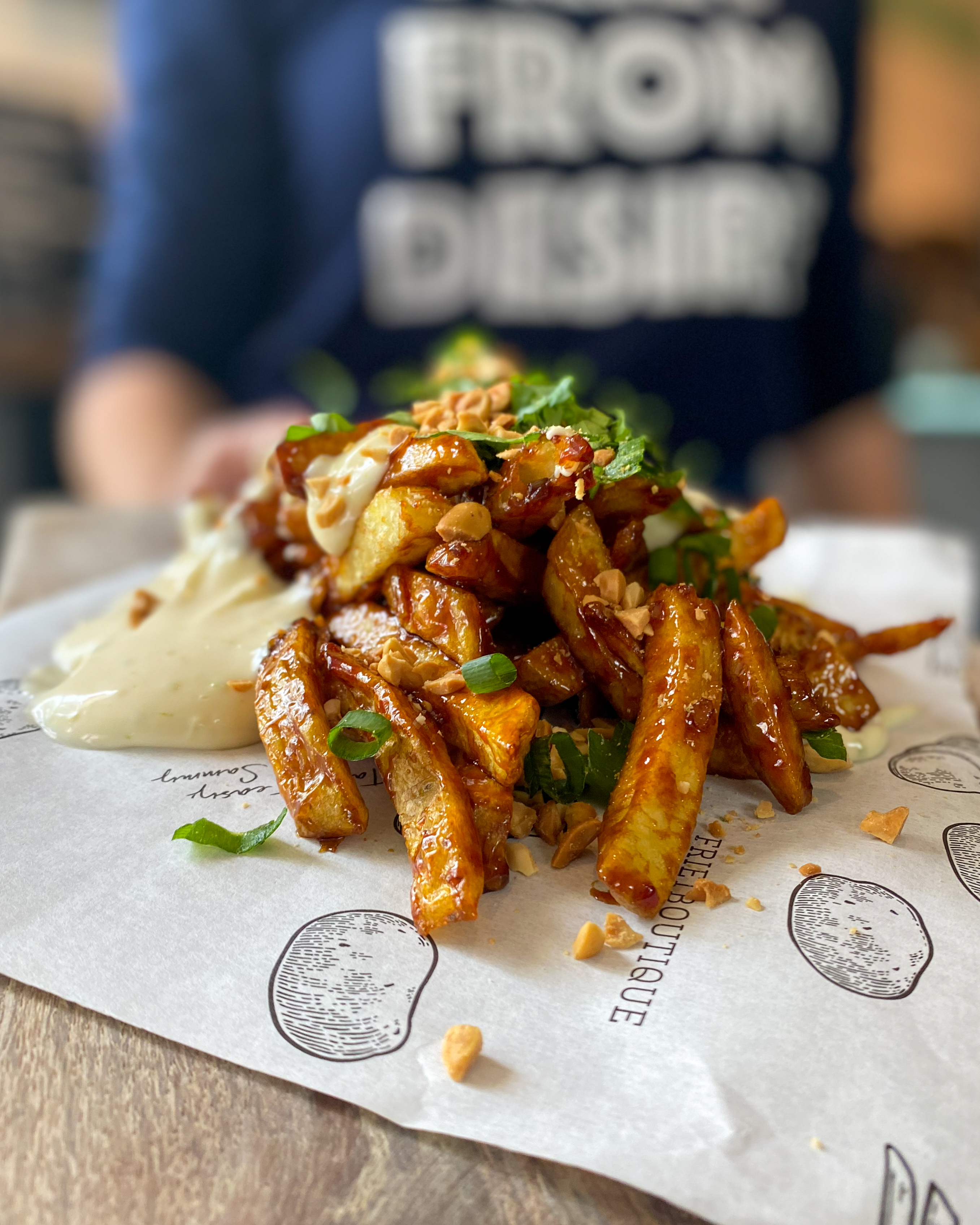 De ambachtelijke friet mét schil (zoals je bij Frietboutique gewend bent) wordt krokant gebakken in plantaardige olie. Vervolgens wordt de friet gehusseld in Culy’s sticky Thaise saus. De sticky friet wordt geserveerd met limoen-mayo, bosui, gehakte pinda’s en koriander (en voor de koriander-haters, ja: je kan het frietje ook zonder koriander bestellen).
