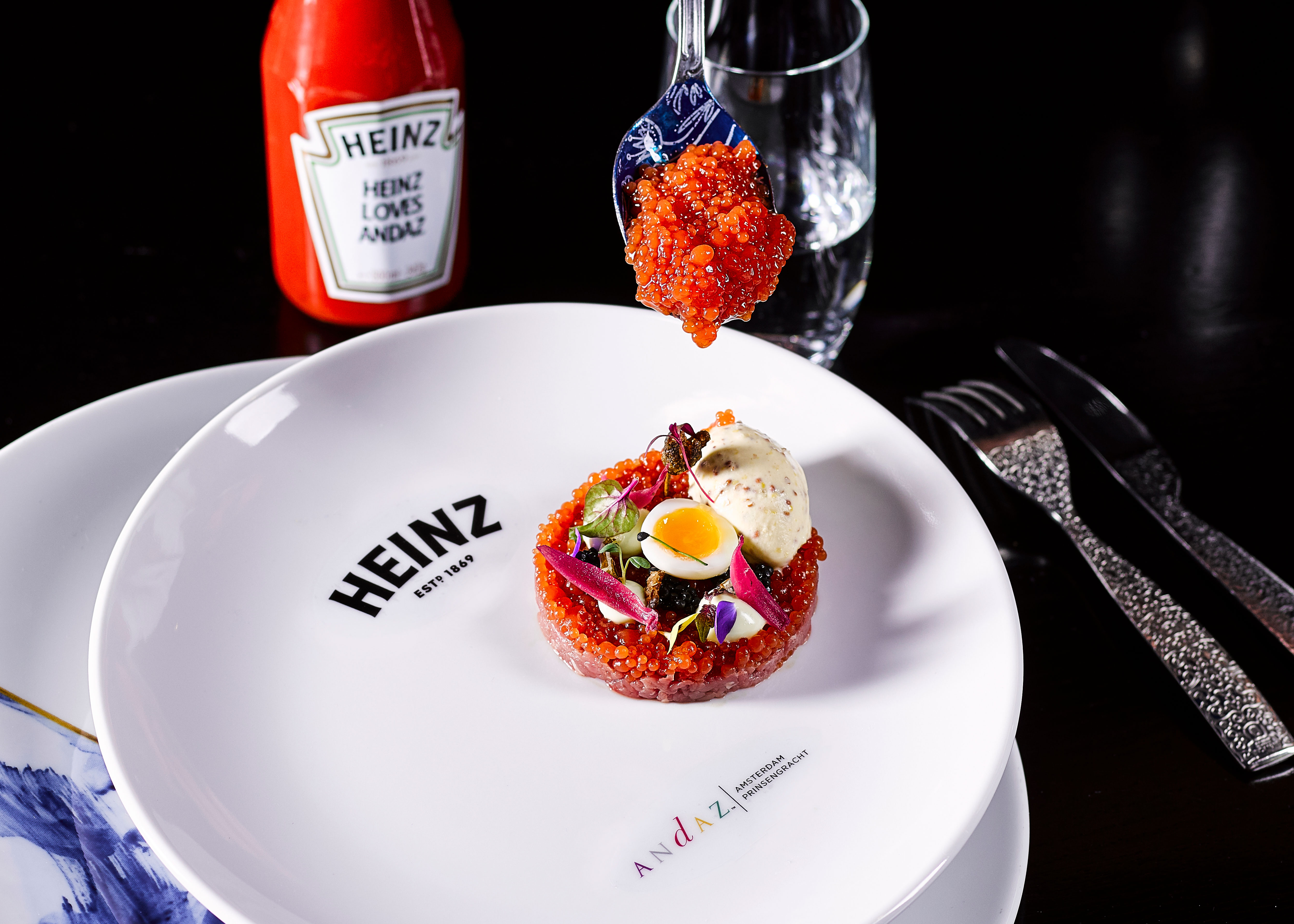 En daar hebben we meteen een bruggetje te pakken: naar het Andaz Amsterdam Prinsengracht, om precies te zijn. Want om de samenwerking tussen Heinz en de zanger te vieren ontwikkelden chef Iasonas Panagoulis en zijn team een exclusief menu voor restaurant Bluespoon in het Andaz. Met in de hoofdrol… Heinz Tomato Ketchup!