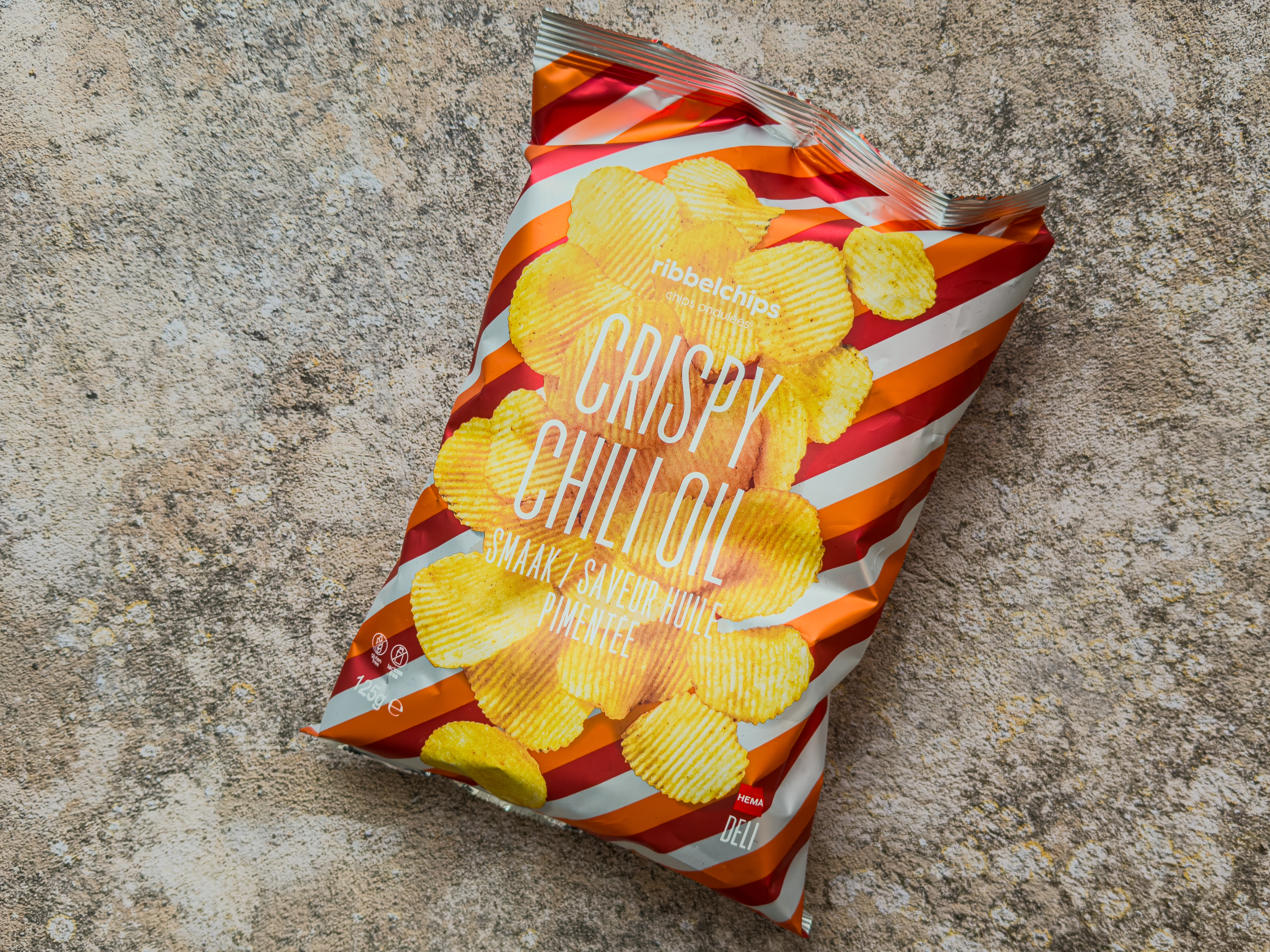 In 2014 kwam de keten al met het behoorlijk unieke idee om rookworstchips op de markt te brengen, inspelend op de gekke chipssmakentrend die Lays destijds ontketende. Meer dan tien jaar later lijkt die trend nog niet te gaan liggen: zo tref je momenteel balsamicoazijnchips (!), kruidenboterchips (!!) en hotdogchips (!!!) aan in hun assortiment. De chips met crispy chili olie smaak zijn de laatste nieuwkomer in dat schap, iets waar wij onmogelijk rouwig om kunnen zijn