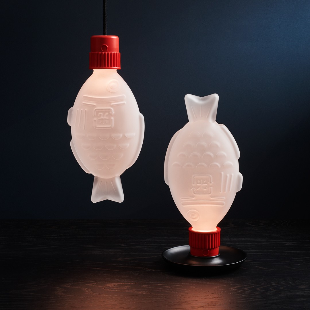 Ken je die ‘plastic visjes’ gevuld met sojasaus die je vaak bij je afhaal-sushi krijgt? Het bedrijf Heliograf bedacht een lamp geïnspireerd op die sojasaus-verpakkingen. Waarom? Om aandacht te vragen voor duurzaamheid.