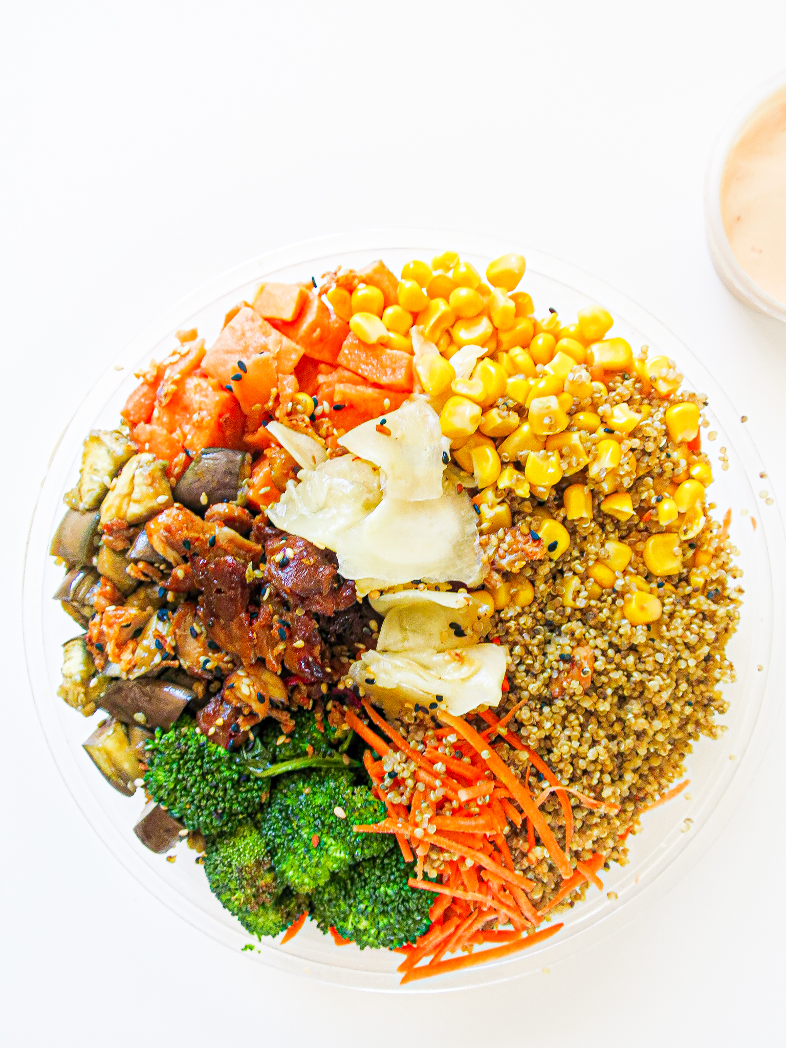 Ook leuk: bij de bestelling heb je de keuze om nog extra toppings toe te voegen. Bij de Slow Cooked Beef kiezen we voor extra avocado en mango (zijn we dol op en we vermoeden dat dit lekker zal zijn bij het vlees), bij de Teriyaki Chicken kunnen we het niet laten om de miso-aubergine toe te voegen.