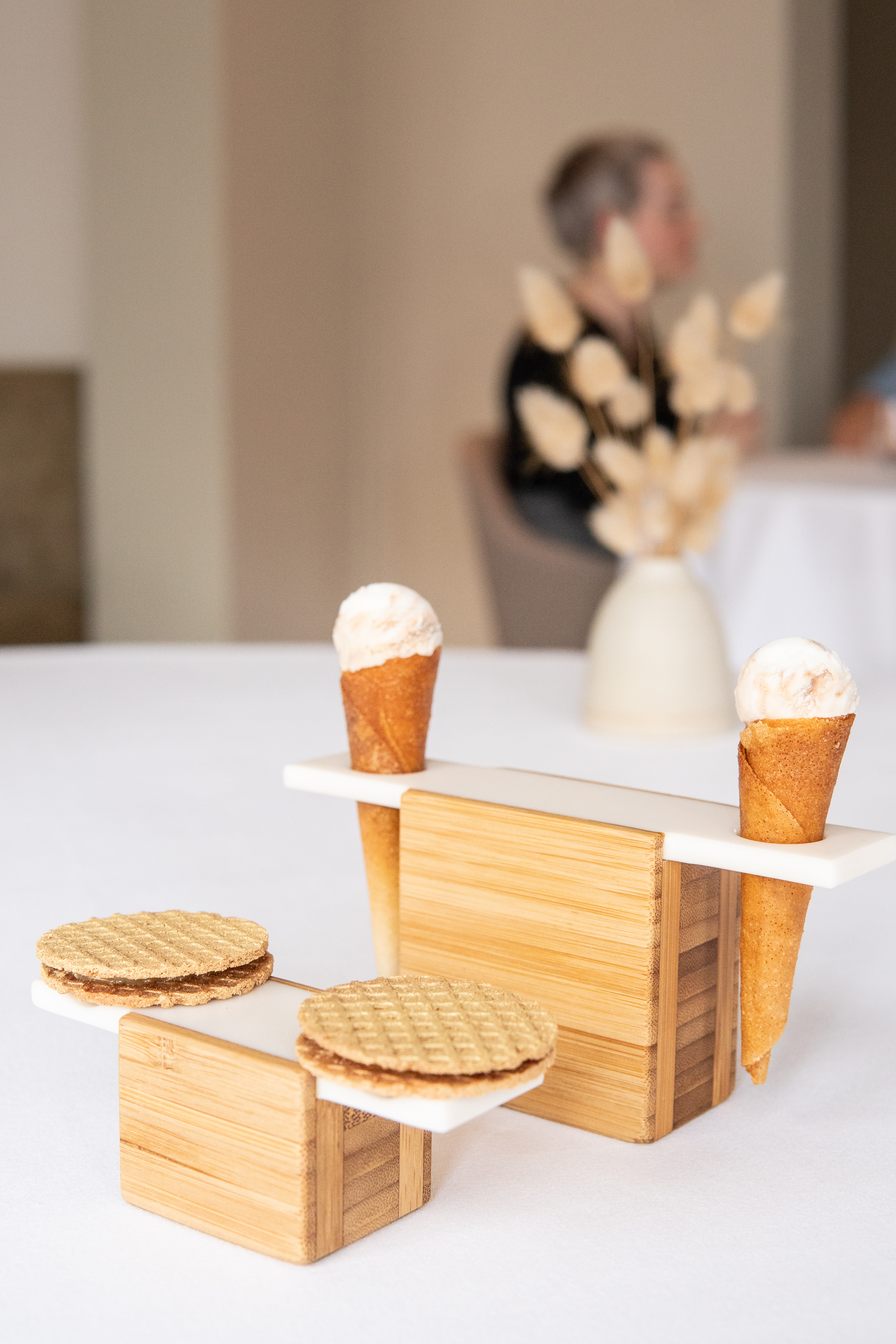 Het pre-dessert: ijs van Haagse hopjes in een hoorntje, Goudse stroopwafel.