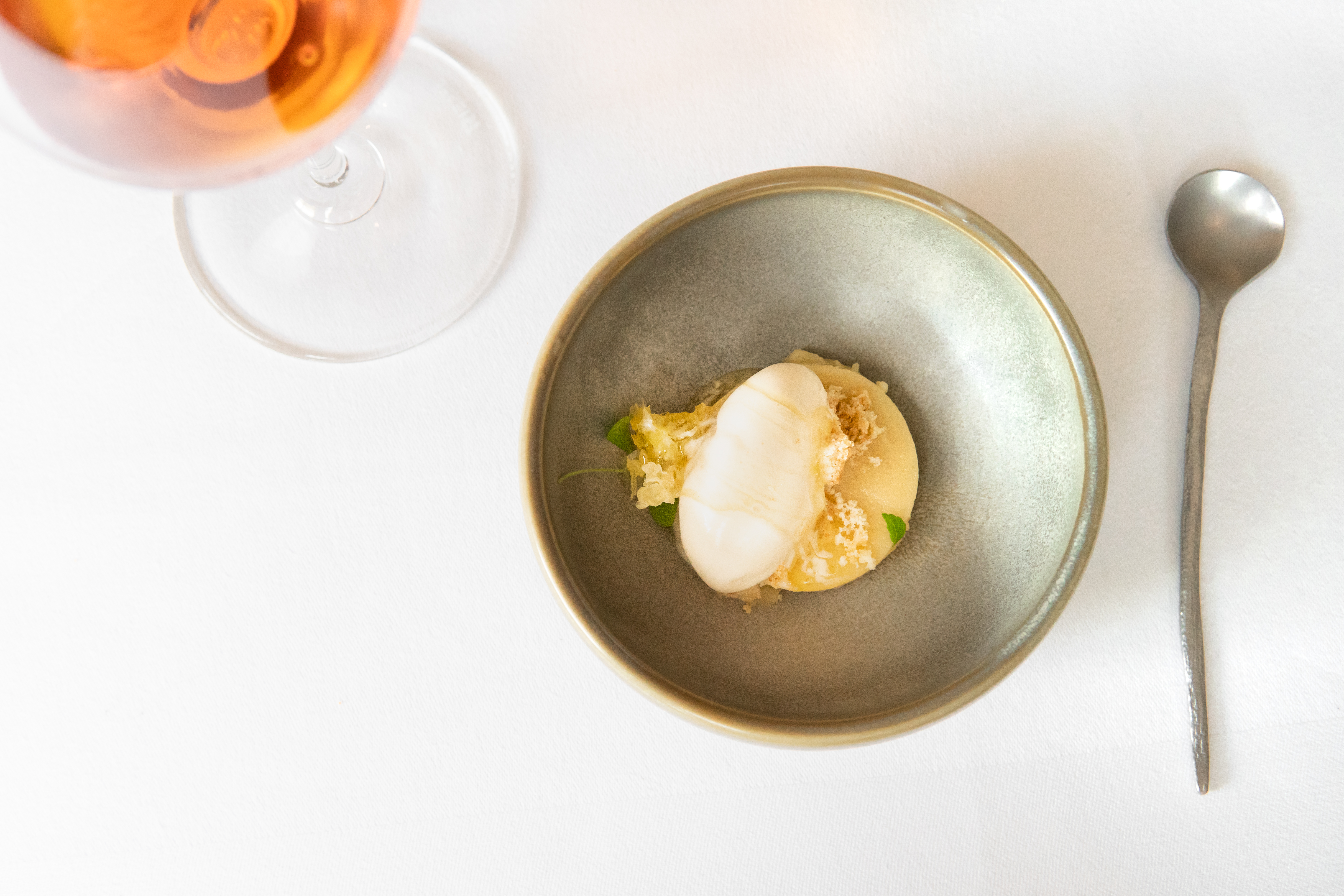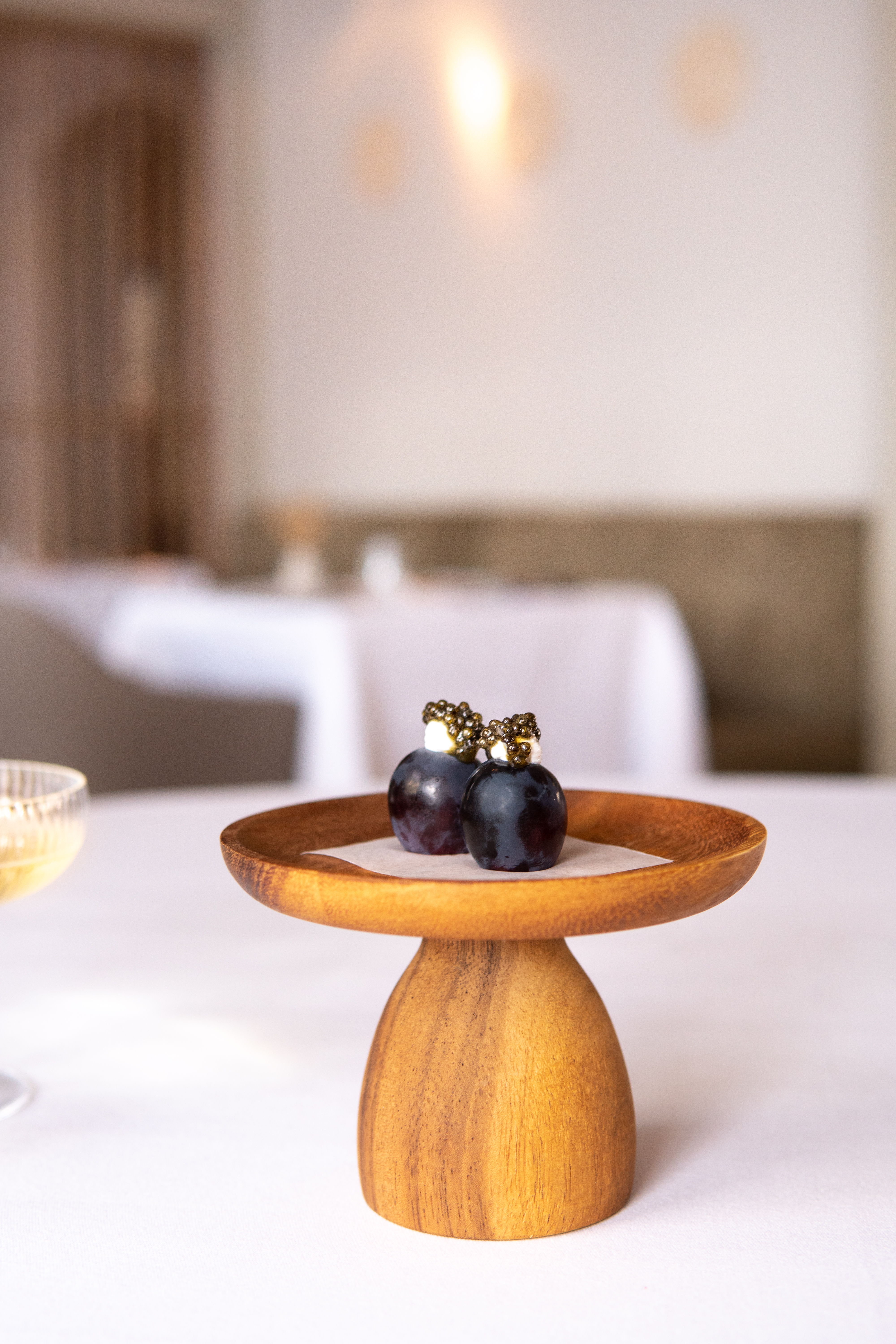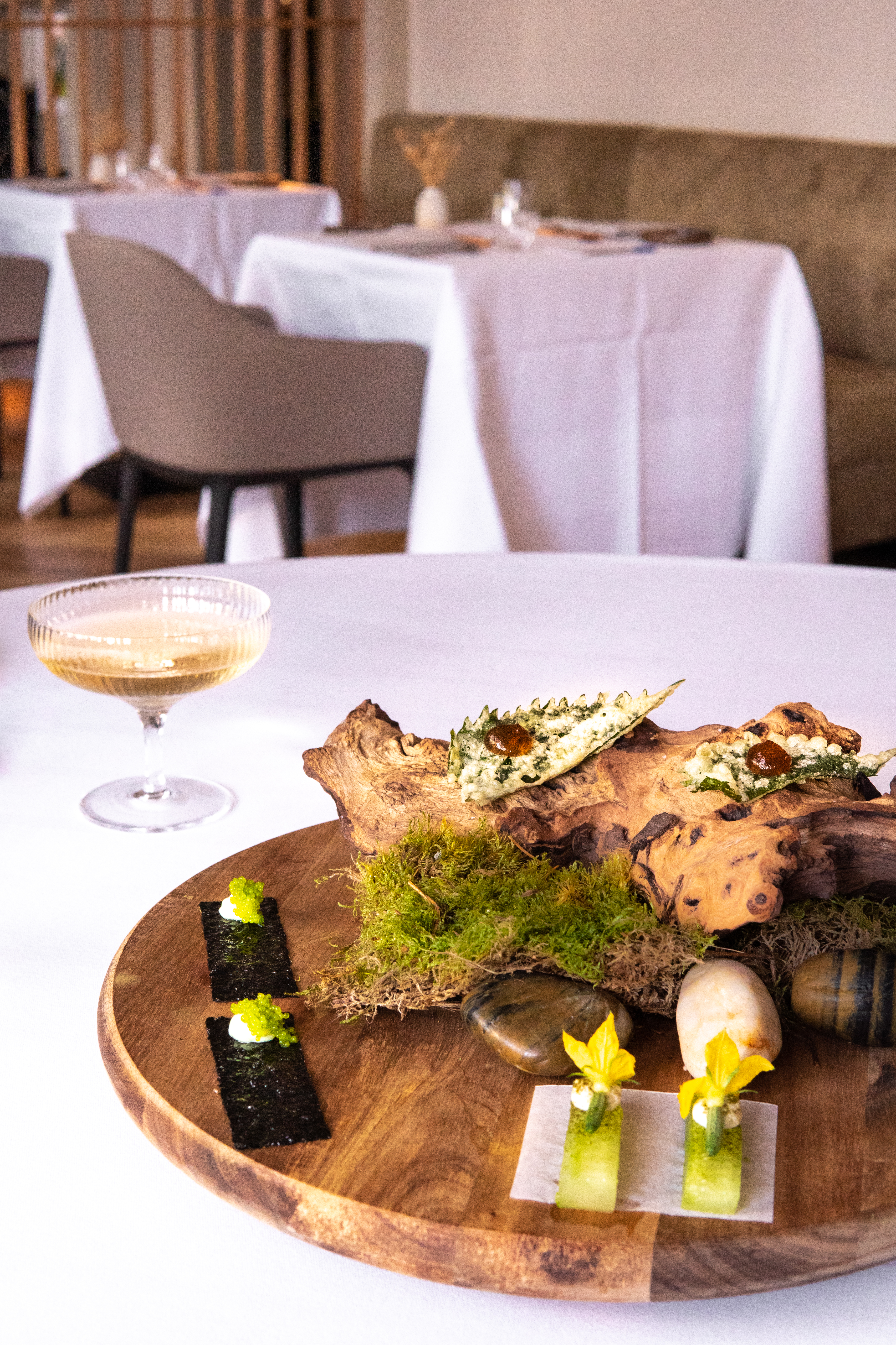 Van deze filosofie is geen treffender voorbeeld van denkbaar dan de eerste amuse: de lokale Frankentaler druif, opgetuigd als een Japans kokeshi-poppetje, met behulp van een dotje zure room en kaviaar.