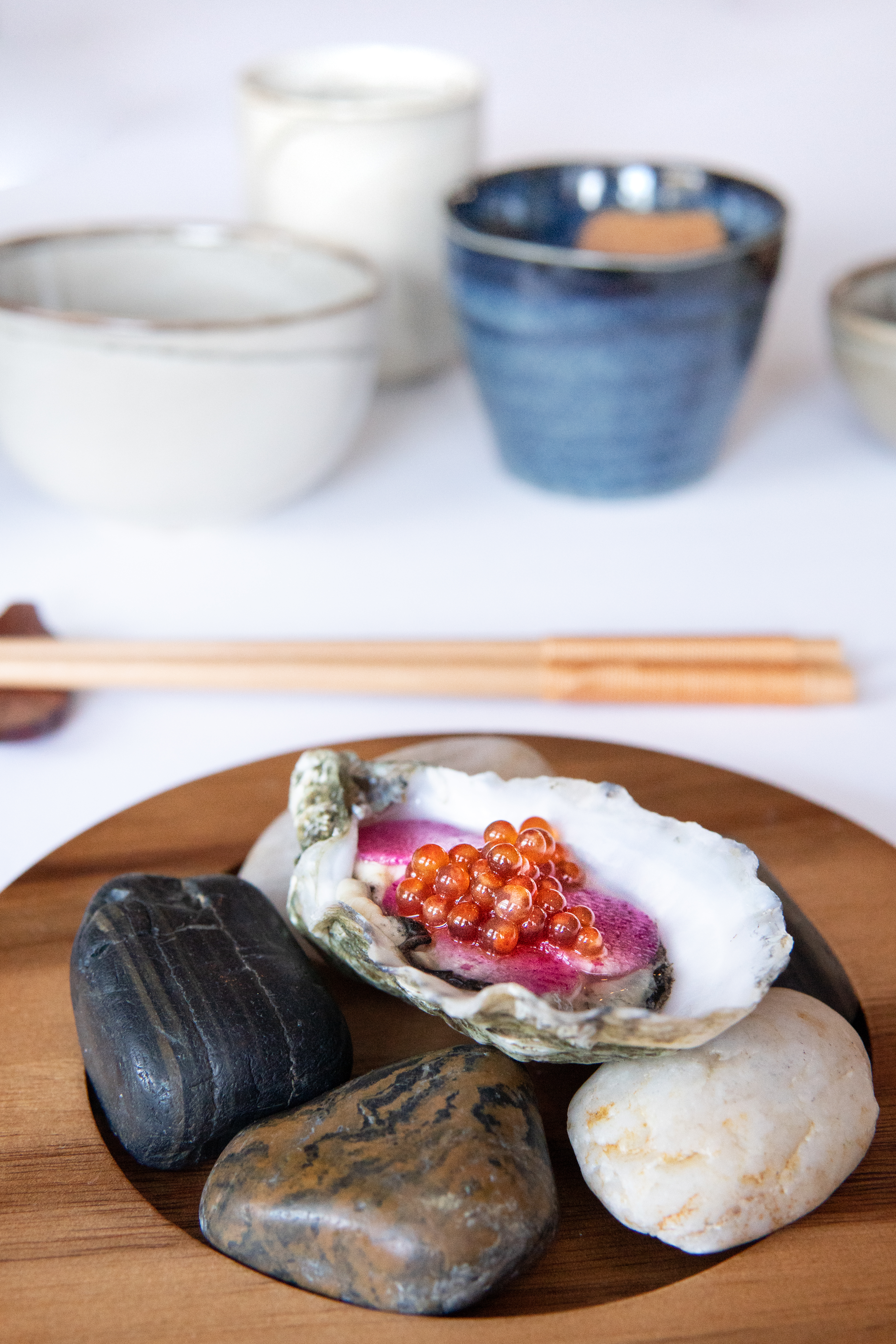 Als dat nog niet genoeg is om van in culinaire extase te vallen, dan wel de eerste gang. Op tafel verschijnt een prachtige oester met red meat radijs en vinaigrette van foreleitjes, geflankeerd door vijf kleine kommetjes met Japans-geïnspireerde gerechtjes. Ze allemaal beschrijven zou duren van hier tot Tokio, dus we lichten er een paar uit.