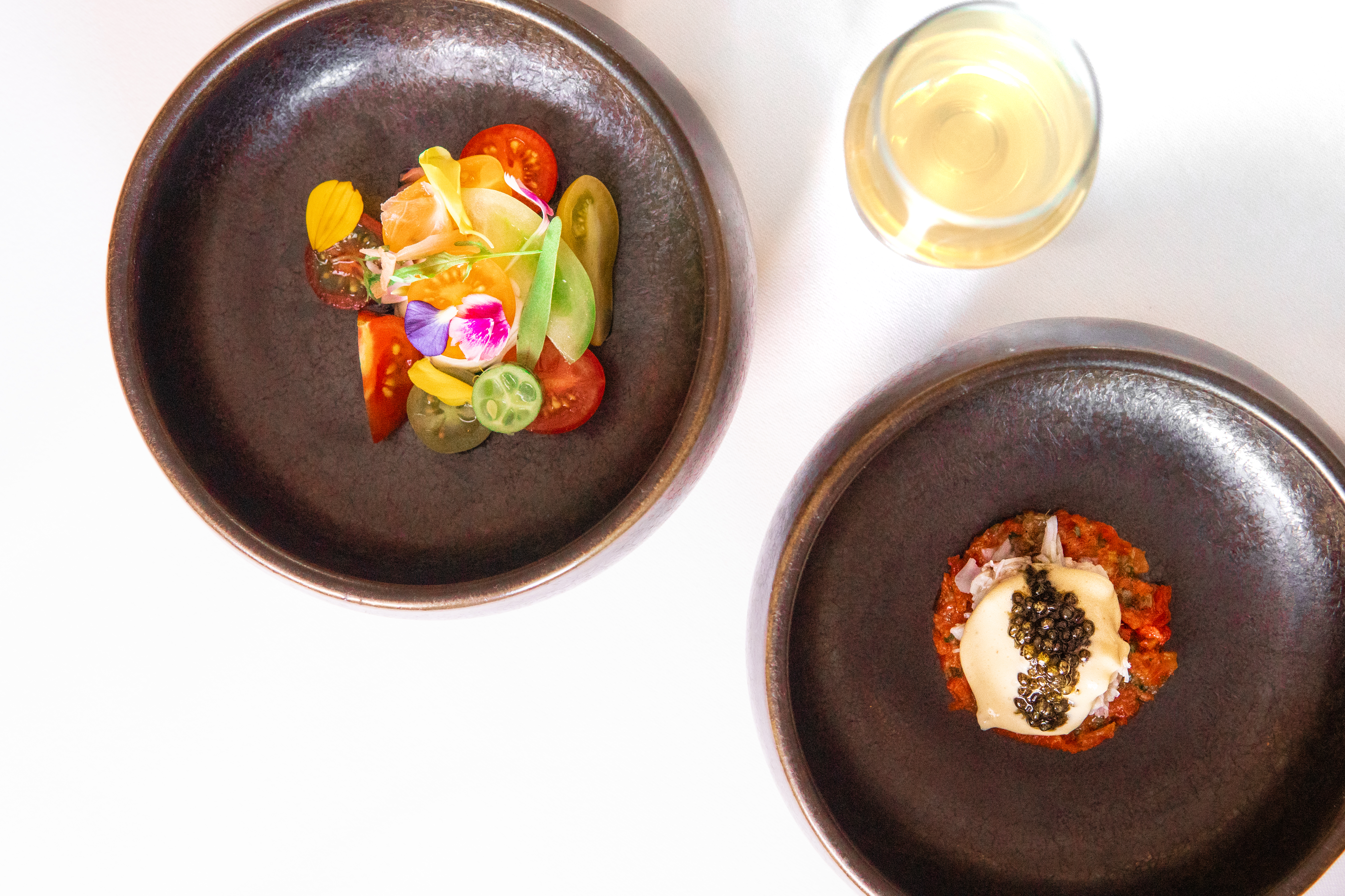 De steak tartare is vega en gemaakt van tomaten die 24 uur zijn gedroogd, aangemaakt op de klassieke manier. De tomatentartaar is een signatuurgerecht van de chef, maar deze versie is voorzien van noordzeekrab, sabayon en kaviaar. Het is en blijft een razend knap gerecht, met een al even knappe textuur.