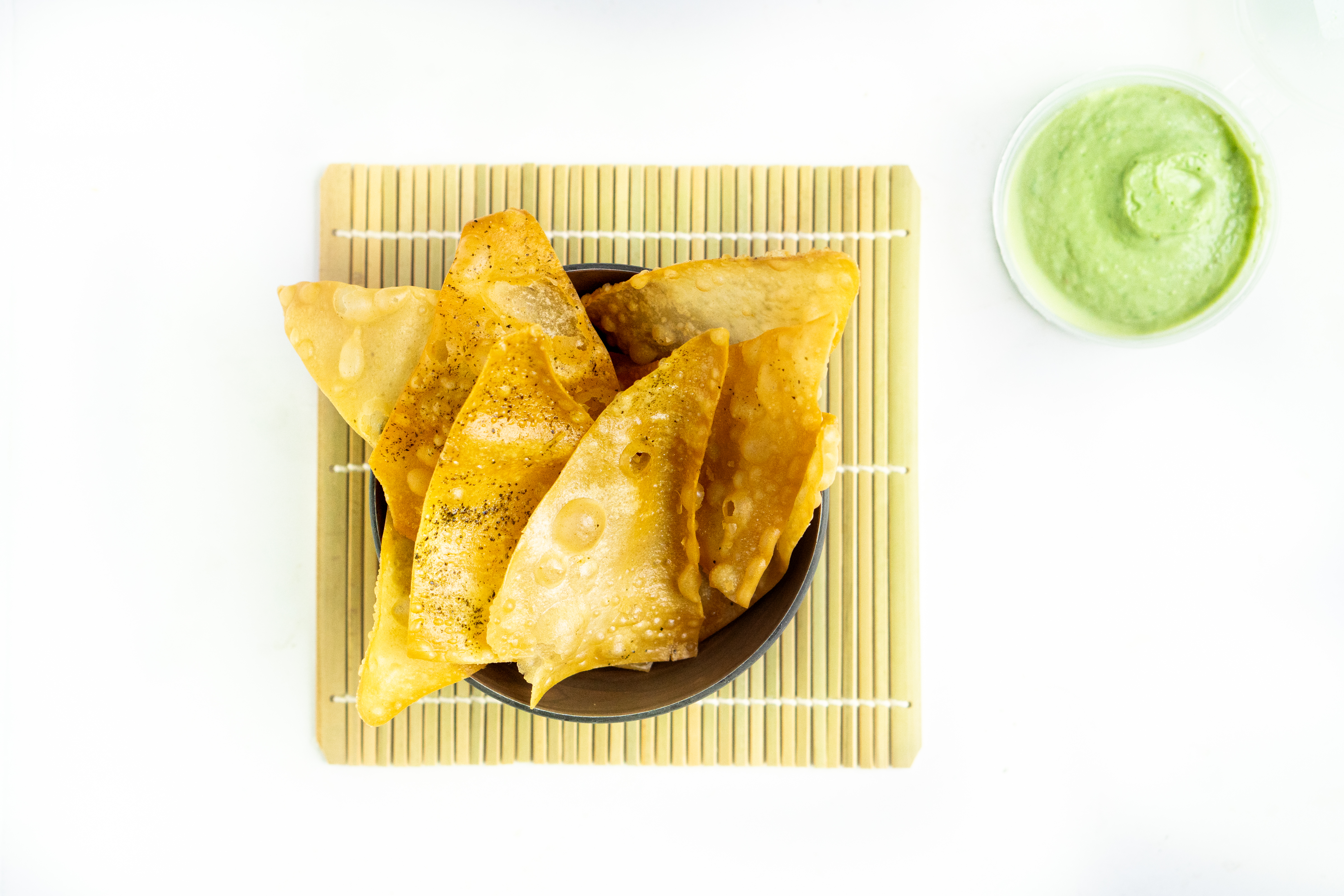 De appetizer bestaat uit homemade wonton chips met wakame mayonaise. Die zijn kant-en-klaar te snacken zonder dat je nog iets hoeft te bereiden. Verslavend lekker.