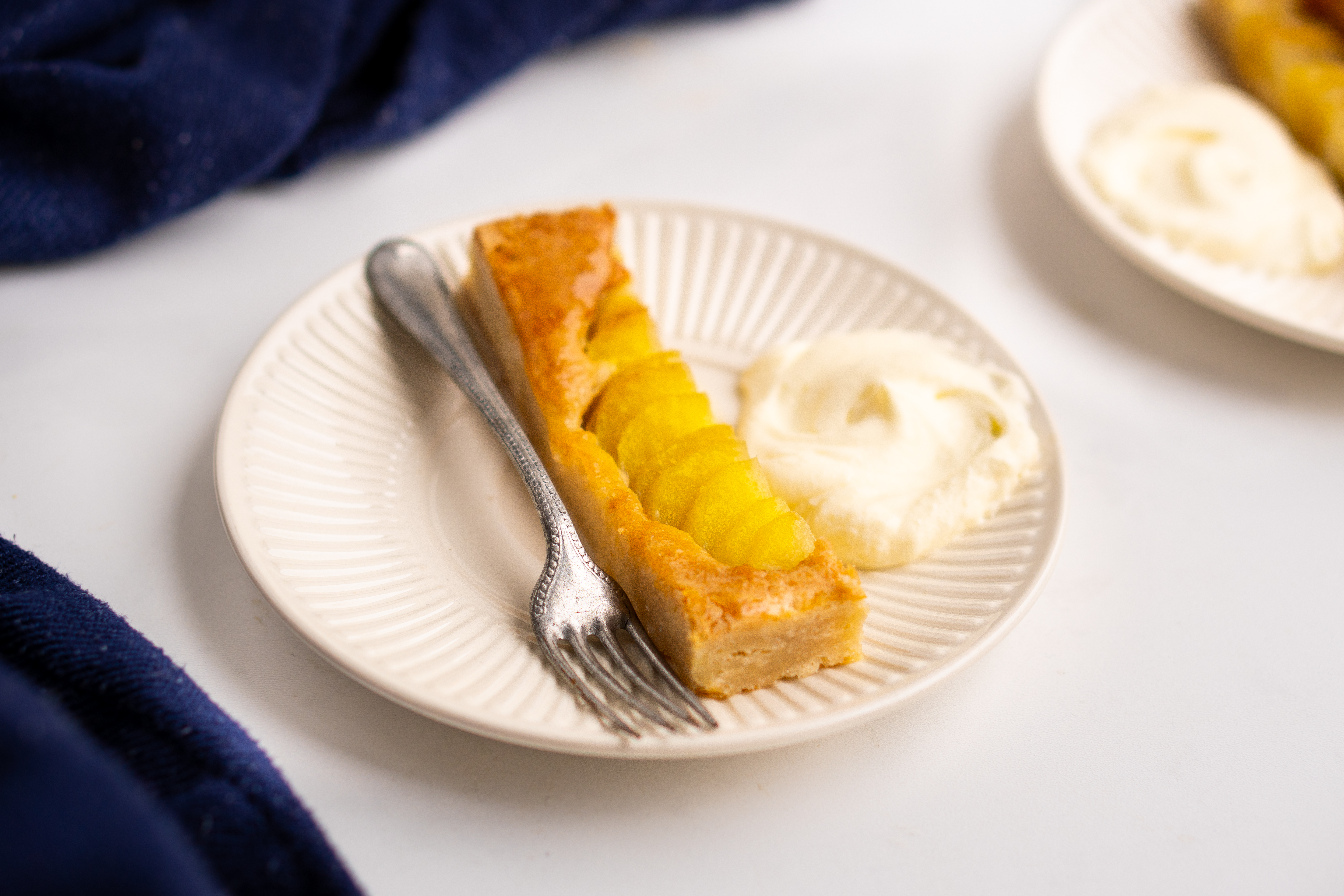 Het dessert is een perentaartje met miso en crème fraîche. De textuur en smaak doen een beetje denken aan frangipane en de miso geeft een aangenaam tegengewicht aan het zoete. Een perfect taartje in zijn eenvoud.