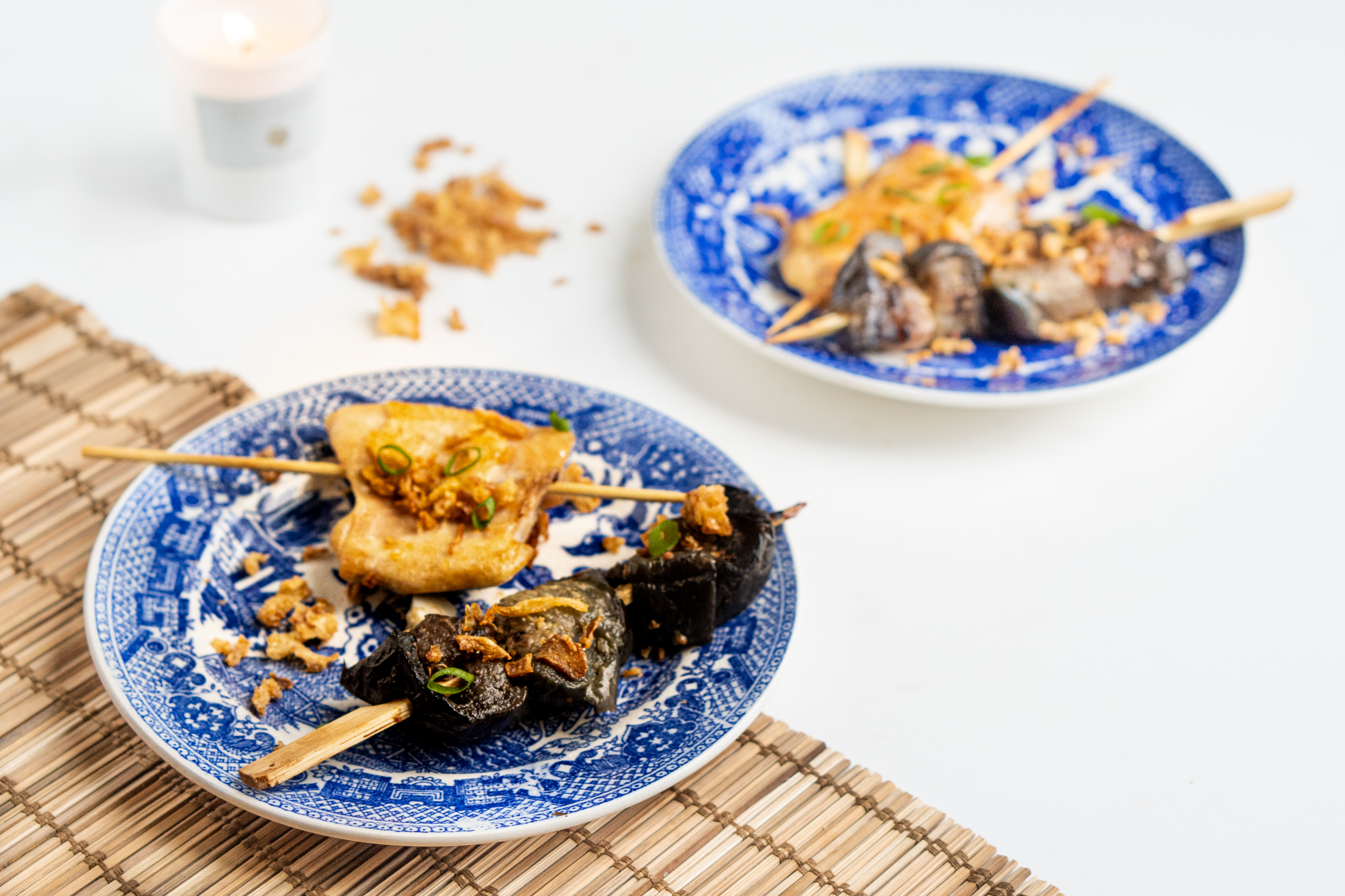 Ondertussen laten we de yakitori-spiesjes met kip en aubergine 5 minuten in de oven garen. Dat levert sappige en malse spiesjes op, met lekker knapperige uitjes er bovenop.