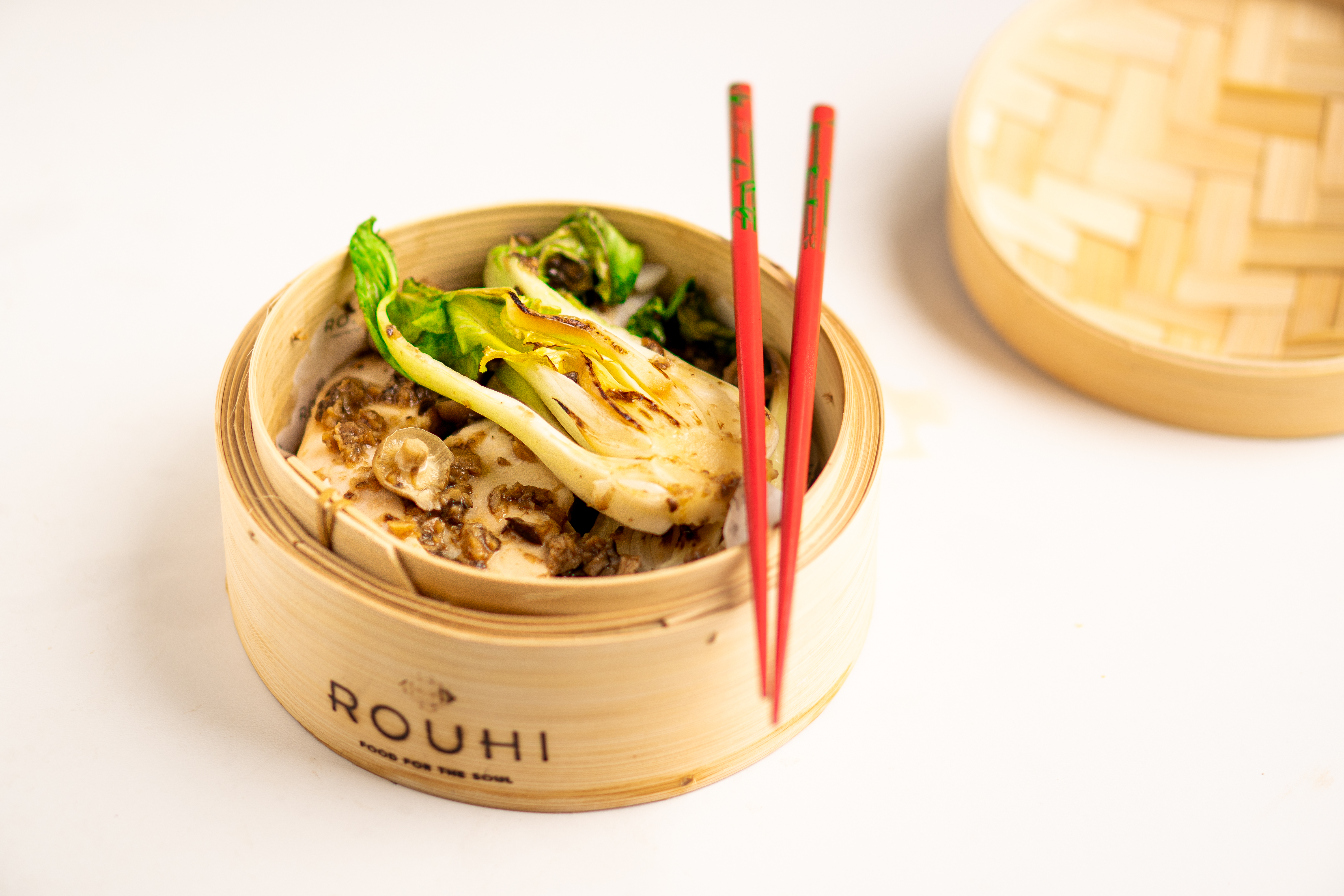 Het hoofdgerecht zit in een stoommandje verpakt. De bijgeleverde instructies lichten toe hoe dat stomen precies in zijn werk gaat. Even later staat er sappig gestoomde kip met paksoi en saus van gehakte paddenstoelen op tafel. Goddelijk lekker, en wat een fantastische groente is paksoi toch.