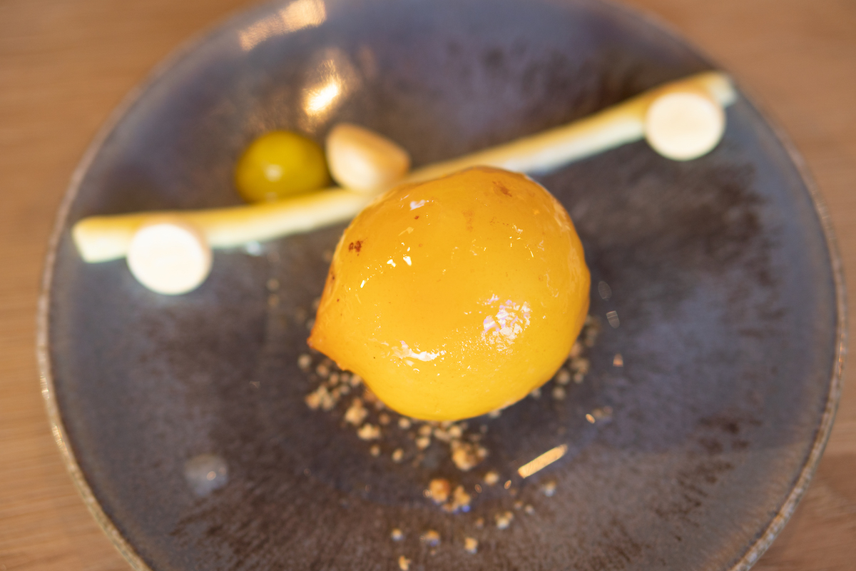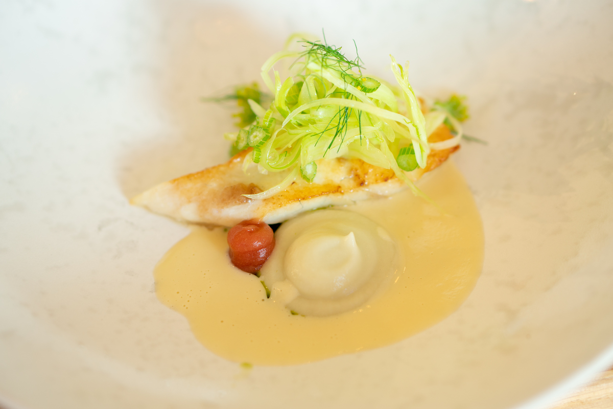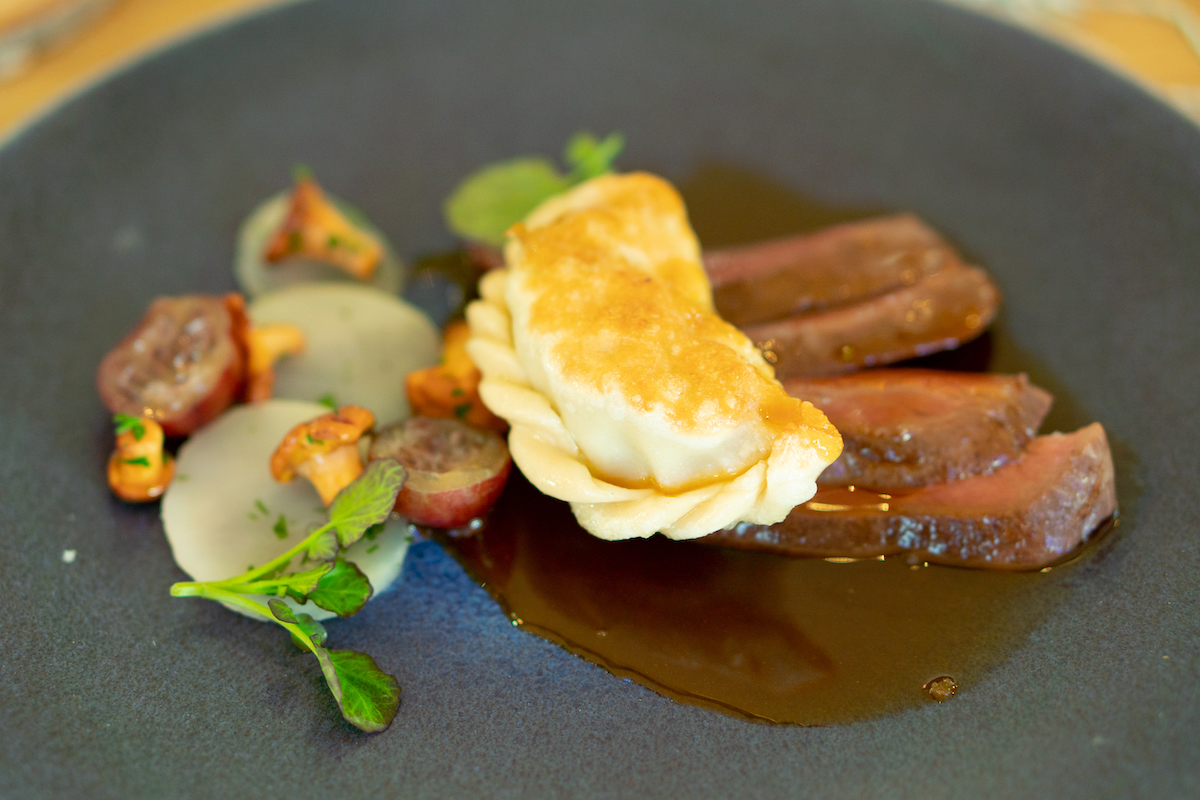 Voor de tweede gang krijgen we tarbot gegaard in hooi, met een saus van venkel en rabarber. Het gerecht is fantastisch; de smaak van het hooi proef je goed terug in de vis en dat geeft ‘m iets bijzonders. De knapperige venkel er bovenop geeft een fijne bite aan het gerecht. Lekker zomers.