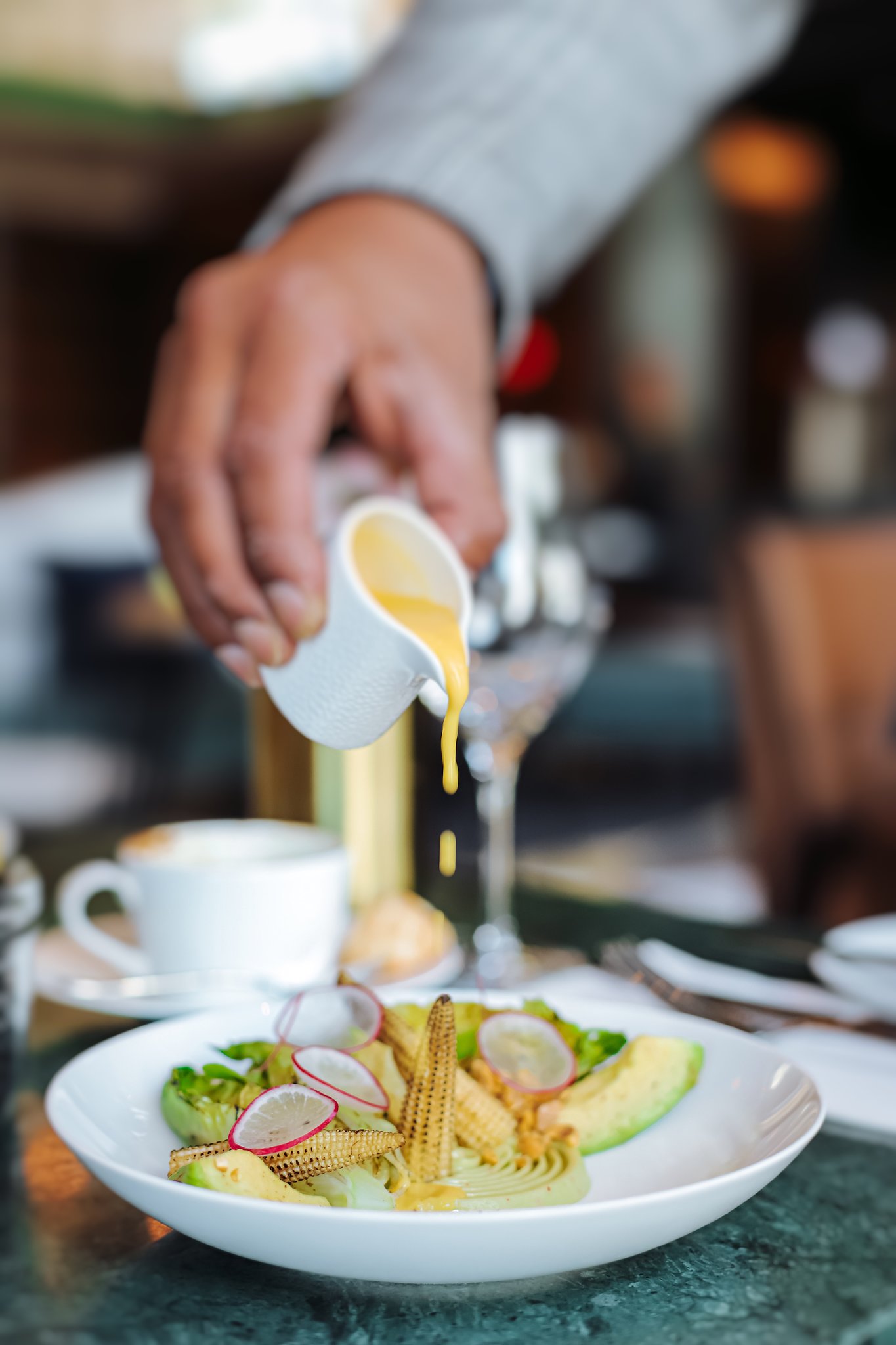 Lunchen in het gebouw waar je een paar uur eerder bent wakker geworden, het heeft iets uitermate gezelligs en luxueus. Wij denken: áls je zoiets doet, doe het dan meteen goed. We laten ons daarom verrassen met een 3-gangen lunchmenu, voor de gelegenheid houden we ’t vega(n).