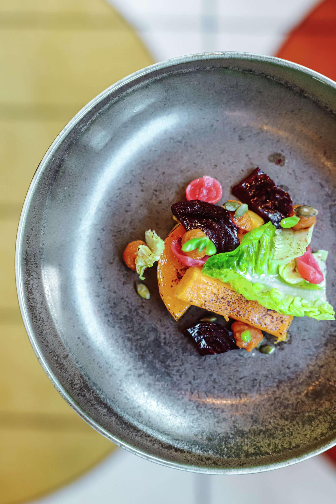 Voor het hoofdgerecht krijgen we een lauwwarme pompoensalade met paarse wortel, zeebanaantjes en pompoenpitten. Perfect voor de tijd van het jaar. Niet te machtig maar toch erg rijk en vol van smaak, zo hebben we het graag.