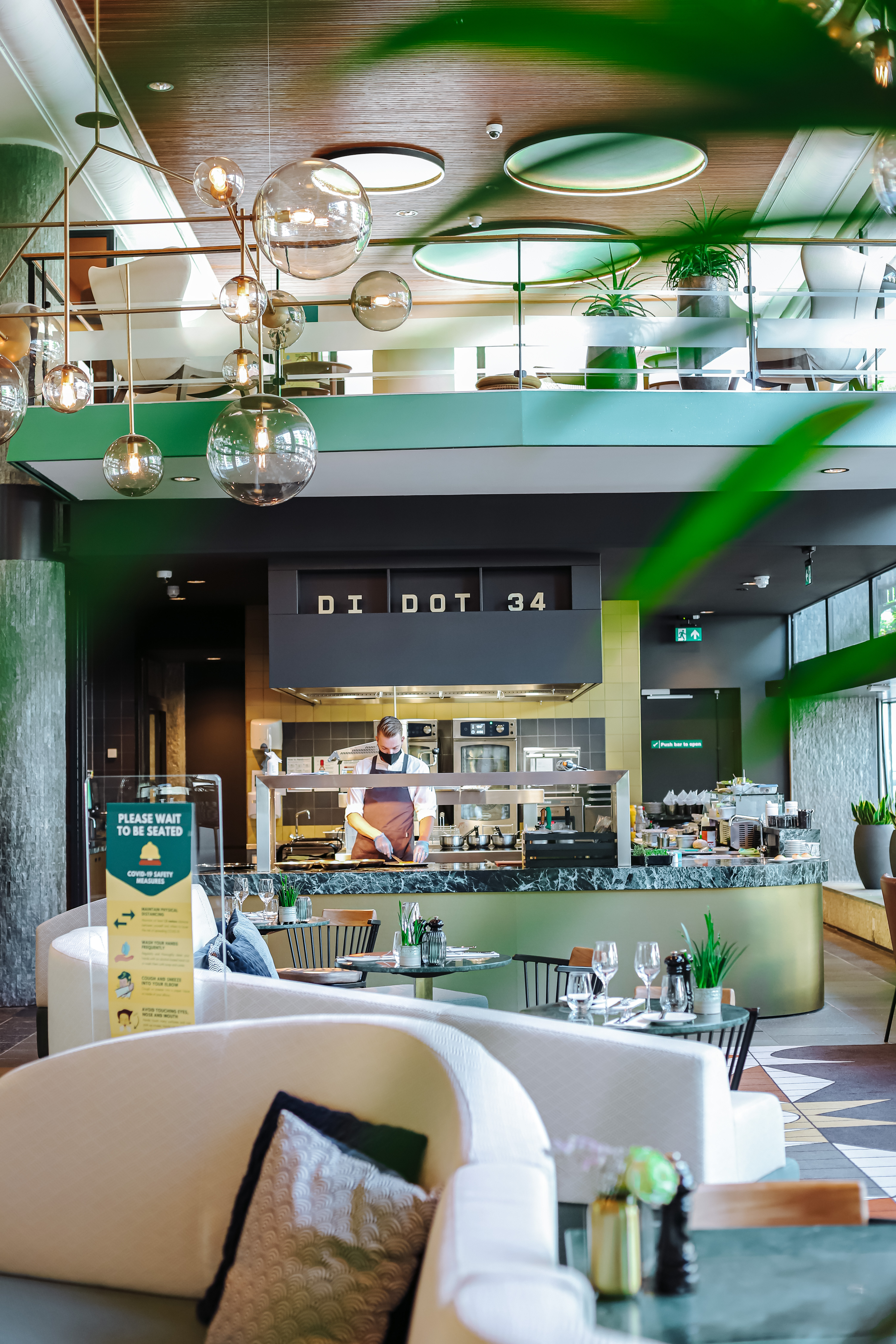 Snel een drankje aan de bar? Dat mag. Toch liever een hapje nuttigen aan één van de hoge tafels? Prima. Liever een uitgebreid menu op een gezellig stoffen bankstel, met zicht op de gasten op de onderste verdieping? Geen enkel probleem. En dat zonder dat het allemaal kil aanvoelt, mede dankzij gigantische hanglampen, klimplanten op de betonnen muren en hier en daar een vrolijke accentkleur in het interieur. Je snapt de vibe.