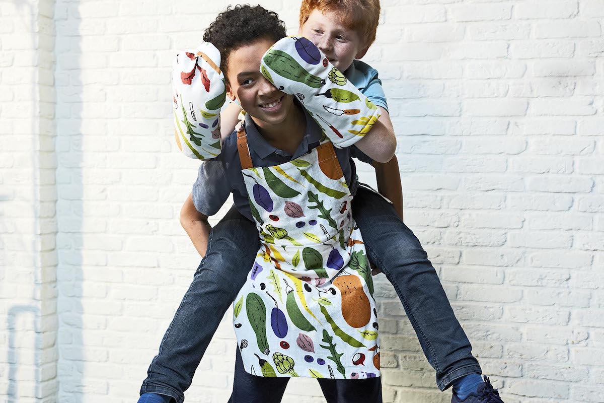 Tot slot is er een aantal soorten textiel voor in de keuken, gemaakt van biologisch katoen. Je kunt bijvoorbeeld vrolijk bedrukte theedoeken, pannenlappen, ovenwanten én een schort kopen. Dat laatste is zowel voor volwassen als kinderen, zodat je lekker samen de keukenprins(es) uit kunt hangen.