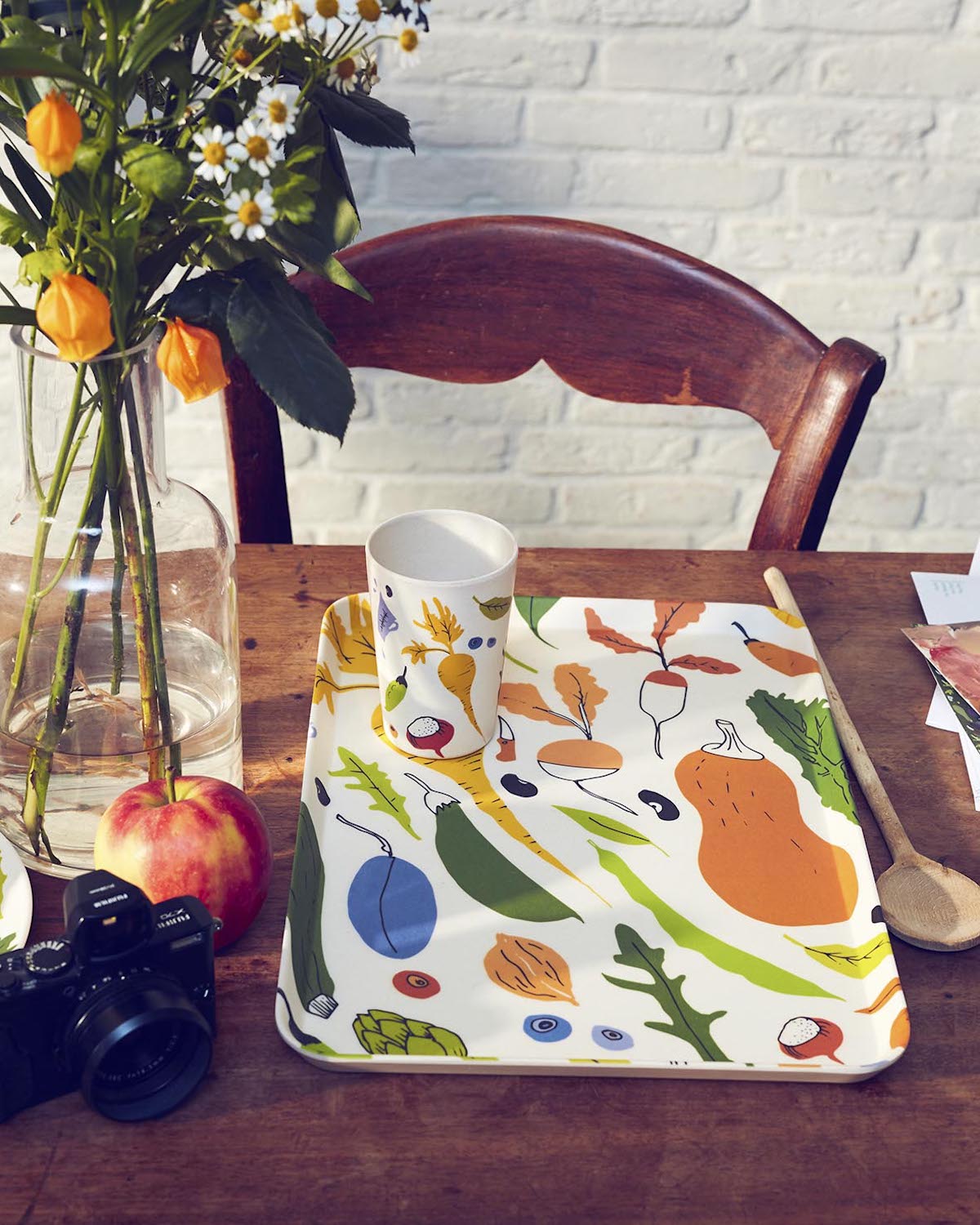 Al het servies is beschilderd dan wel bedrukt met de vrolijke illustraties die je ook uit Yvettes kookboeken kent. En omdat het de vegetables-collectie is, zijn dat in dit geval de favoriete zomergroenten van de kok. Van radijsjes tot peultjes en artisjok: you name it. Wordt je picknick toch net een beetje extra door opgefleurd.