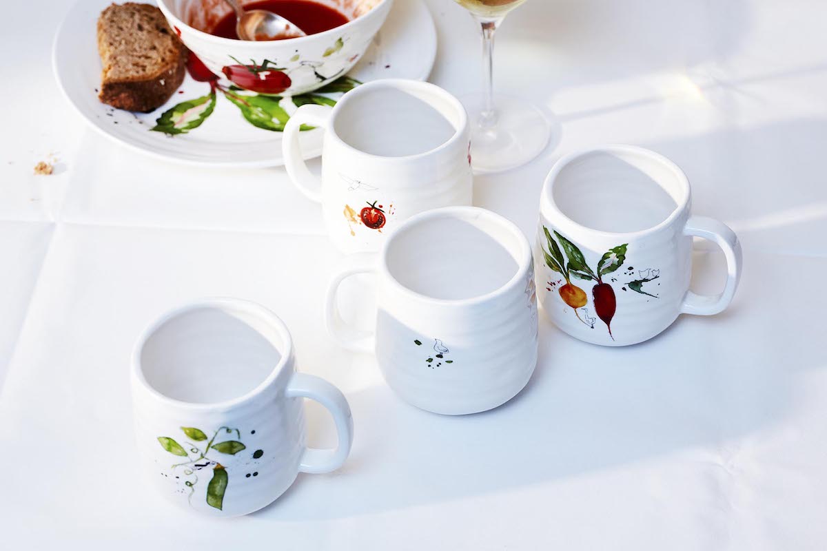 Voor haar ontwerpen haalde ze vooral inspiratie uit allerlei groentes: haar eerste lijn met servies en tafellinnen heet niet voor niets de vegetables series. Die bestaat uit 25 items: van klassieke borden tot een dienblad van bamboe én theedoeken en schorten.