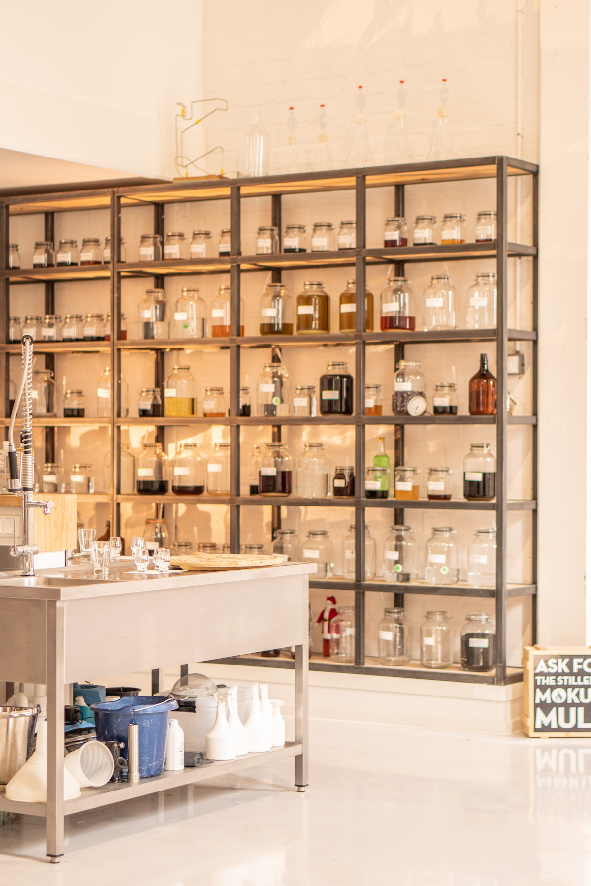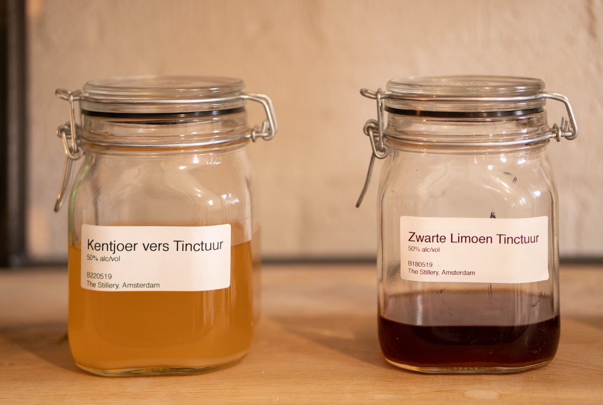 Missie van deze Amsterdamse drankstokers is dan ook om spirits zoals vroeger te maken – ambachtelijk gestookt dus – maar wél in een nieuw, Amsterdams jasje. We lopen vol bewondering langs de grote kastwand waarin alle tincturen staan die Pascal maakt. Dat gaat van sichuanpeper naar verse watermeloen, wasabi wortel (“Dat is het allerduurste product dat hier staat”), naar zwarte limoen en cassia kaneel. In de kleine studentenkamer van Pascal stond al een groot deel van deze collectie.