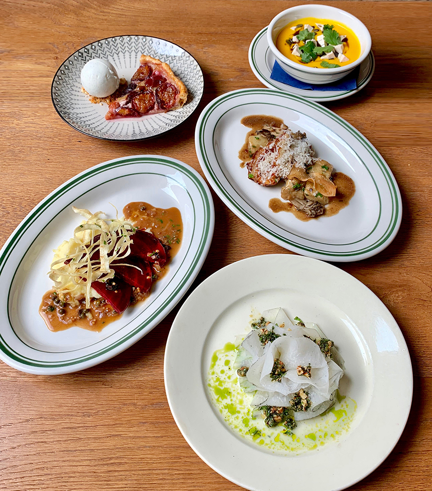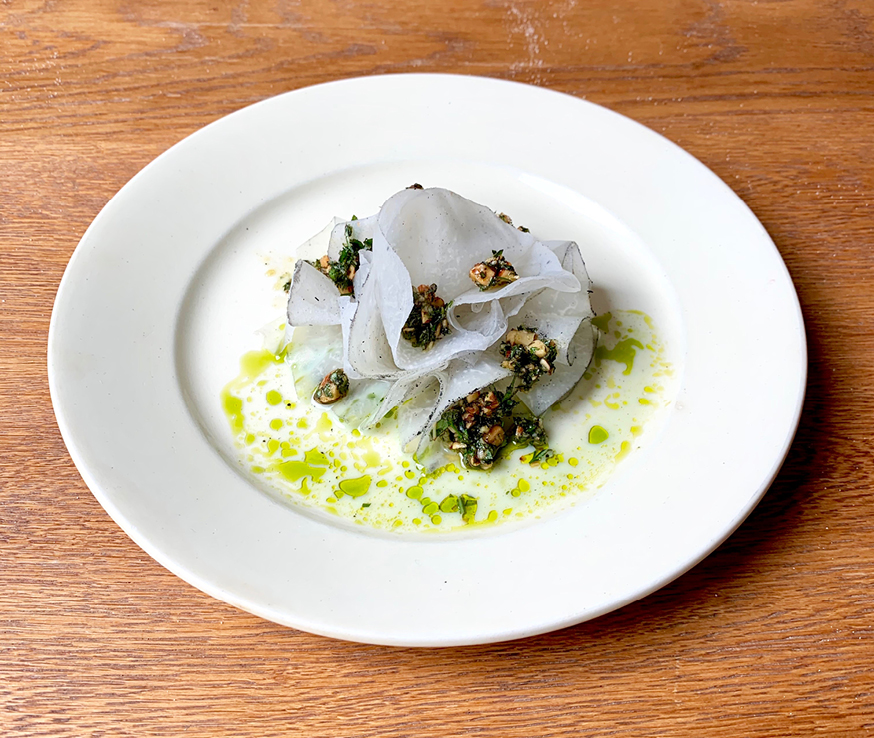 Leuk is dus dat elk gerecht van het vijf gangen tellende menu een smokey element heeft. Het voorgerecht bestaat bijvoorbeeld uit een zijdezachte pompoensoep met gerookte tofu (vegan). Daarna word je getrakteerd op carpaccio van in as gelegde koolrabi, met een pesto van gerookte amandelen (zalig) en karnemelk-dille dressing (bijna nog zaliger).