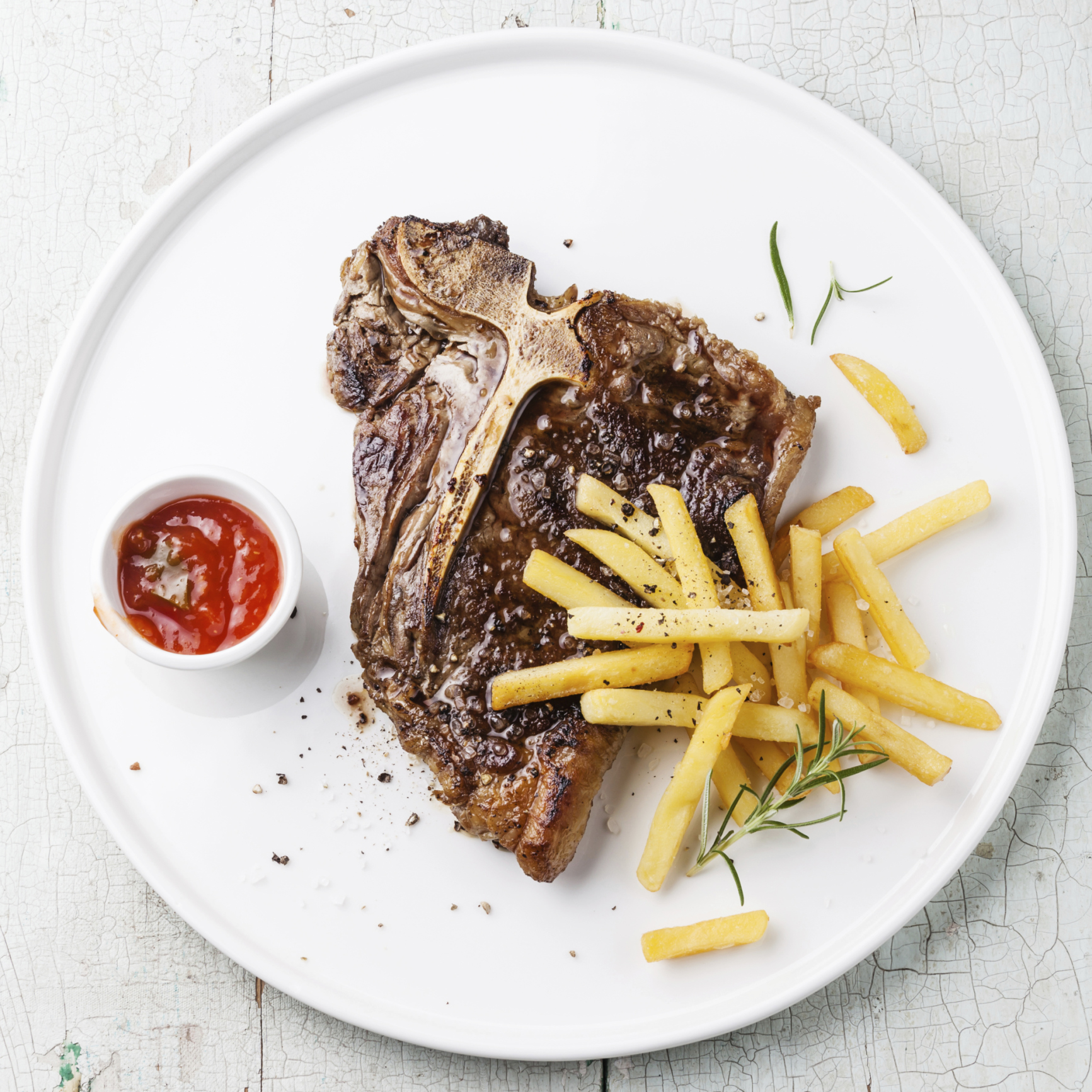 Het bot in de steak is niet alleen voor de sier; het geeft tijdens de bereiding extra smaak af aan het omliggende vlees. Bovendien houdt het de structuur van de steak goed bij elkaar. Serveer de steak met eenvoudige bijgerechten zoals een frisse groene salade of in boter gebakken paddenstoelen om het vlees de hoofdrol te laten spelen.