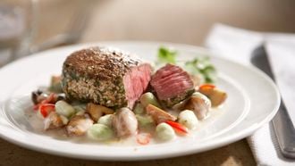 Malse runderbiefstuk met gesmoorde tuinbonen