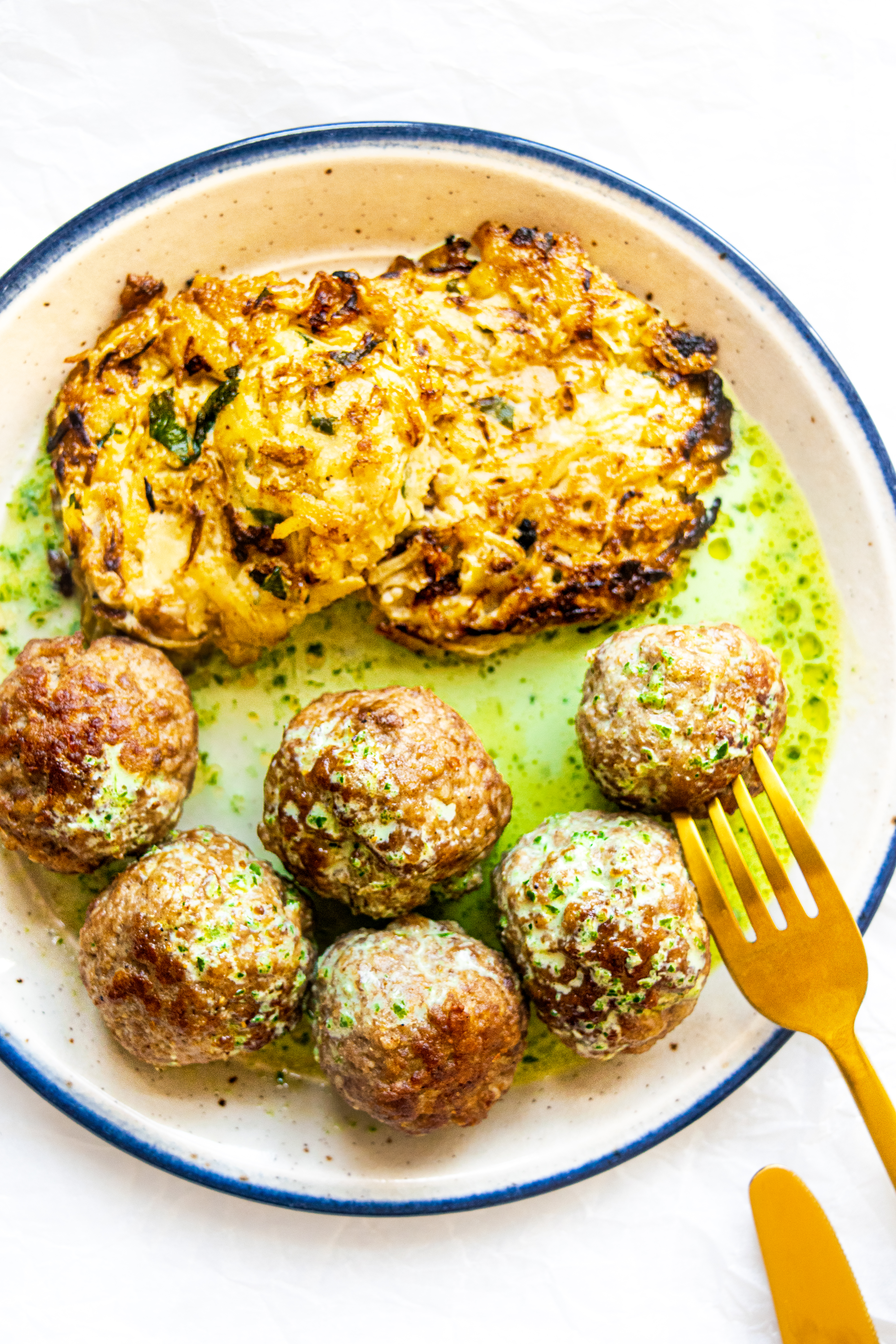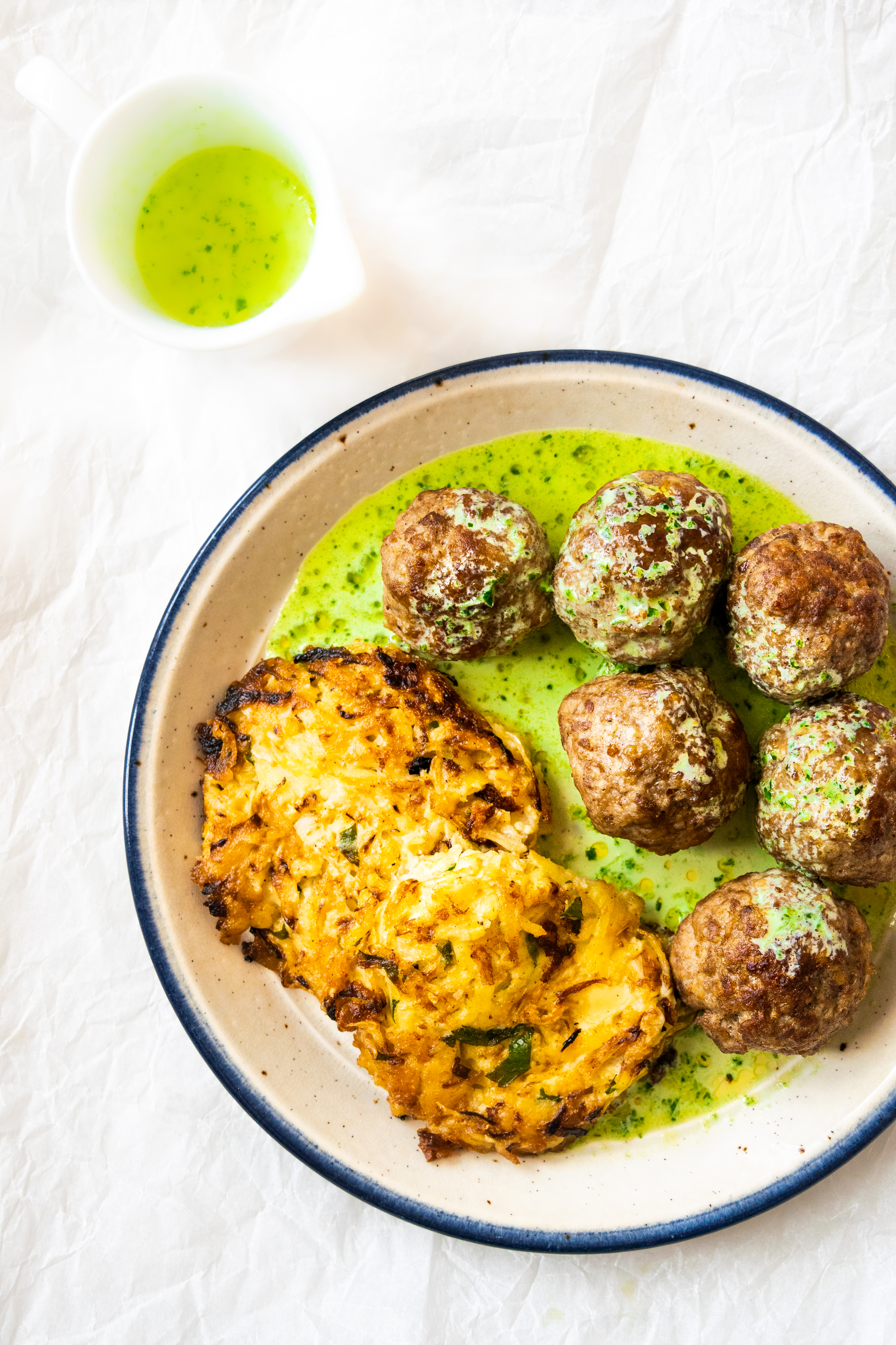 Makkelijke aardappel-spitskoolkoekjes met gehaktballen en peterselieroom