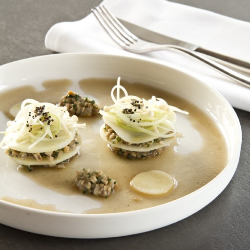 Verwarm de gevulde aardappelravioli licht in de oven tot hij lauwwarm is, dresseer ze dan op het bord, schenk de paddenstoelenbouillon erom heen en leg de bleekselderijsalade op de ravioli.