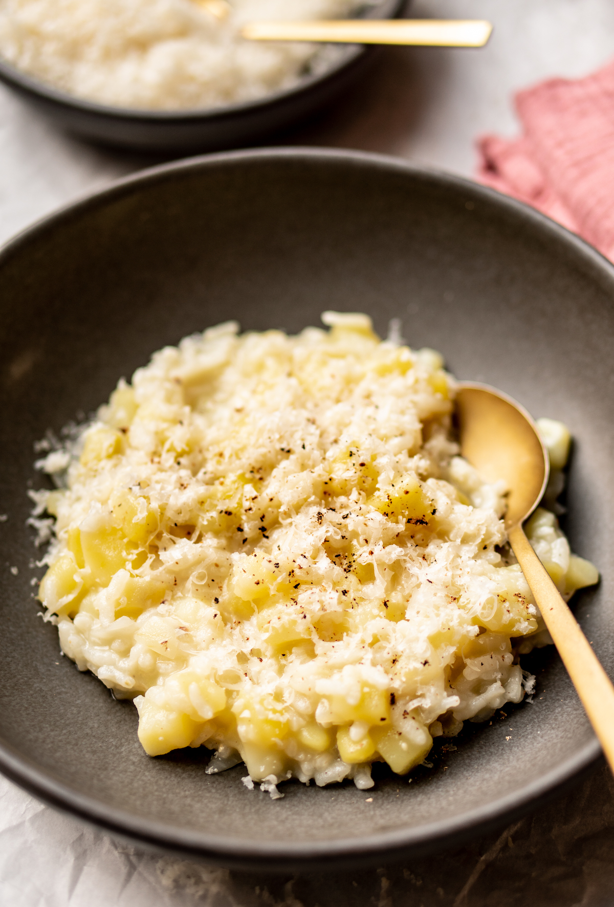 Het is misschien wel de romigste risotto die je ooit hebt geproefd, deze aardappelrisotto. Het klinkt misschien een beetje gek (en als een overload aan koolhydraten), maar het werkt écht. Bovendien is dit een geheel low budget gerecht dat je met ingrediënten uit je voorraadkast maakt.