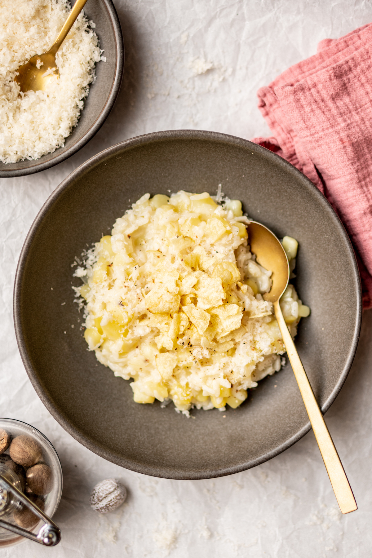 Serveer de aardappelrisotto met nog wat extra geraspte Parmezaanse kaas en wat geraspte nootmuskaat. En dus eventueel met een handje chips!