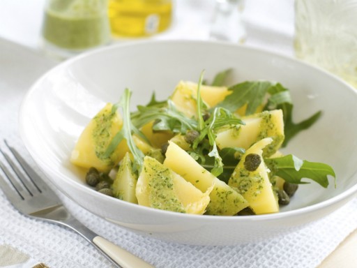Aardappelsalade met groene pesto, kappertjes en rucola