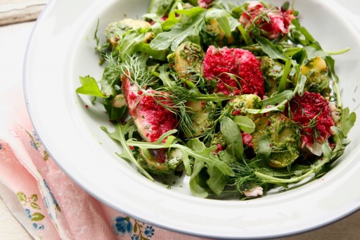 Aardappelsalade met makreel, rucola en bietentapenade