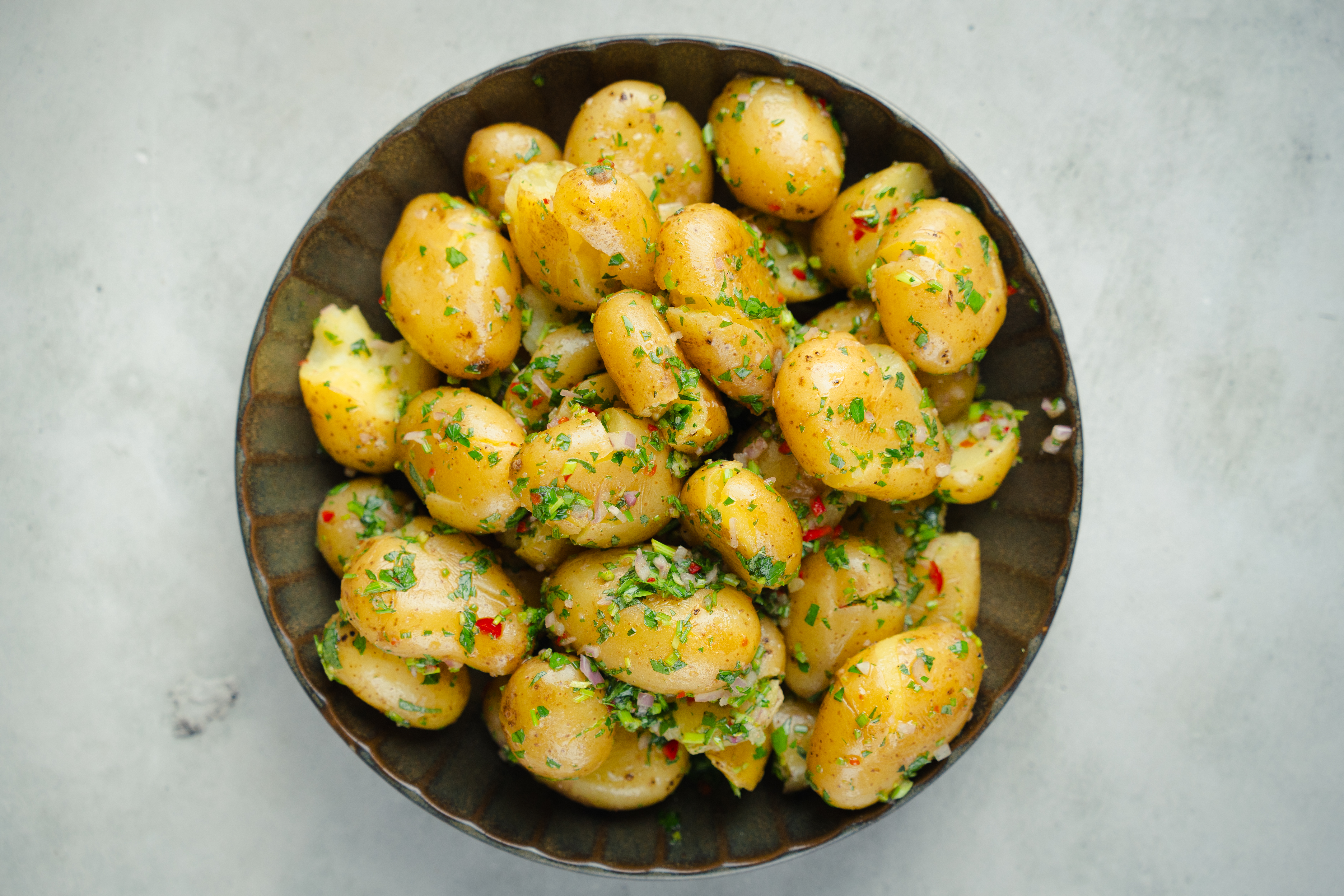 Frisse aardappelsalade met chimichurri en warme krieltjes
