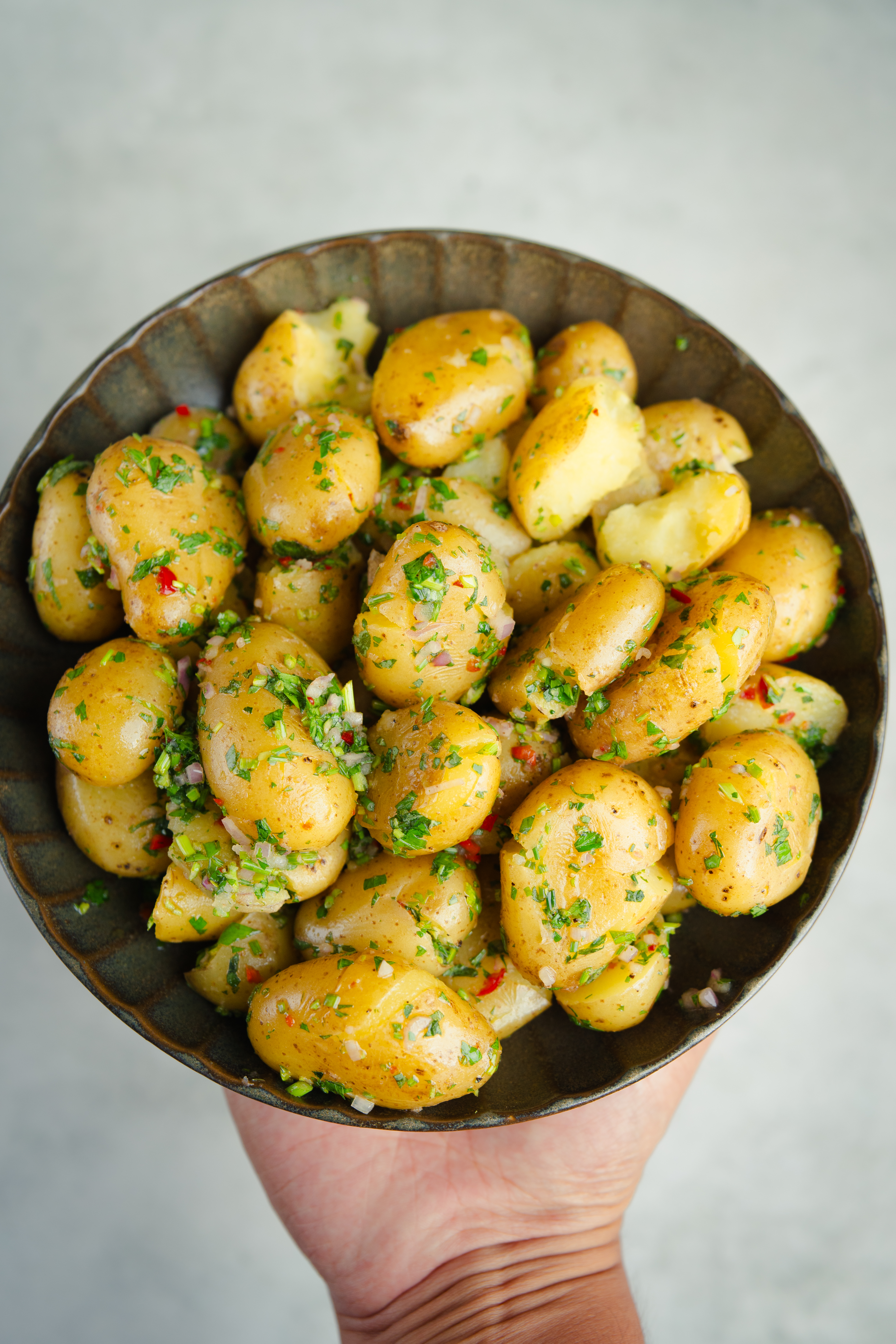 De basis van dit aardappelsalade-recept zijn krieltjes, gekookt in de schil voor extra smaak.
