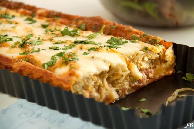 Tip: Voor een vegetarische variant kun je de ham vervangen door 50 gram walnoten door de uien te scheppen. Maak de quiche in een springvorm van 24 cm, want het paste allemaal niet in de rechthoekige vorm.