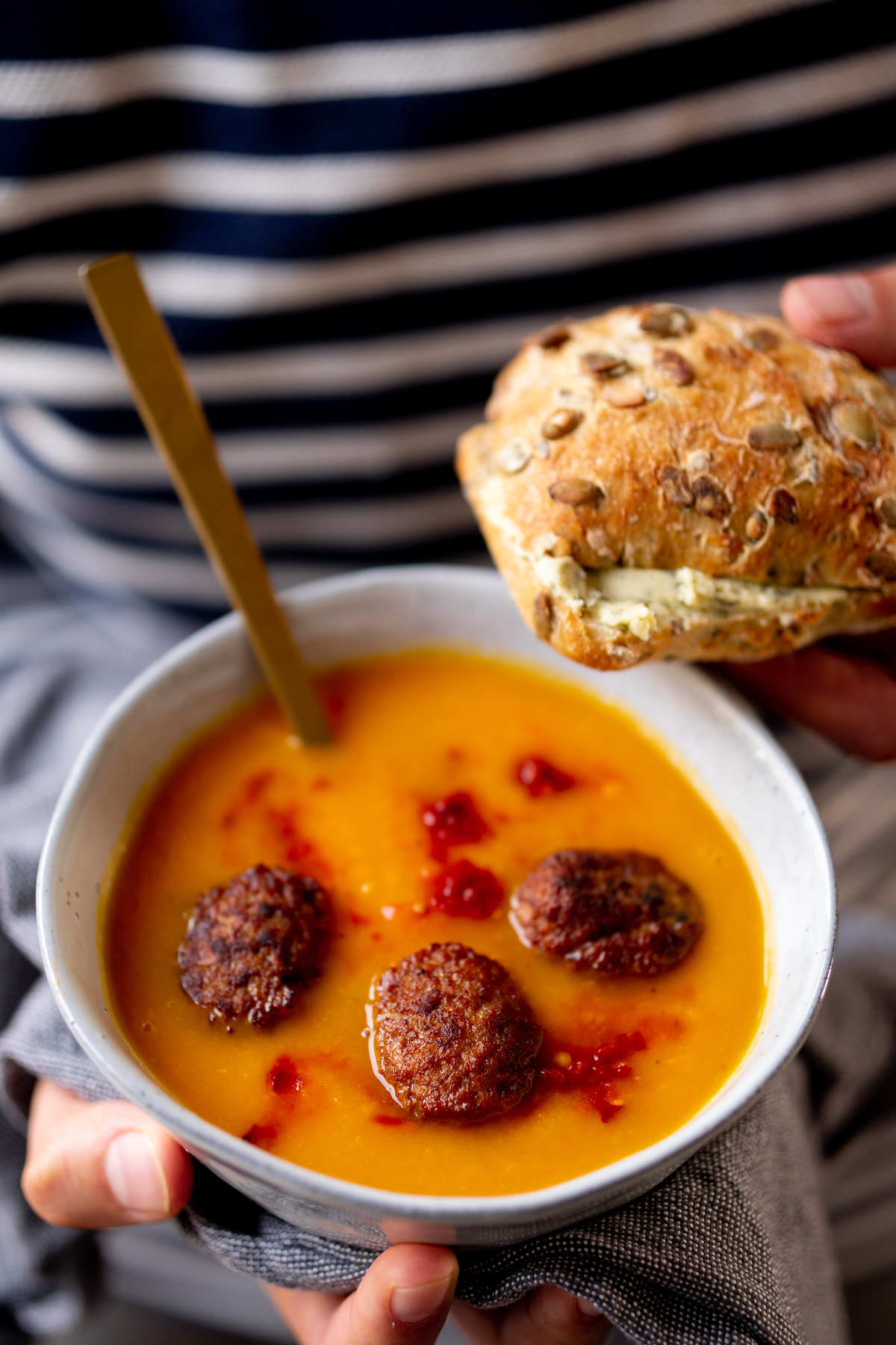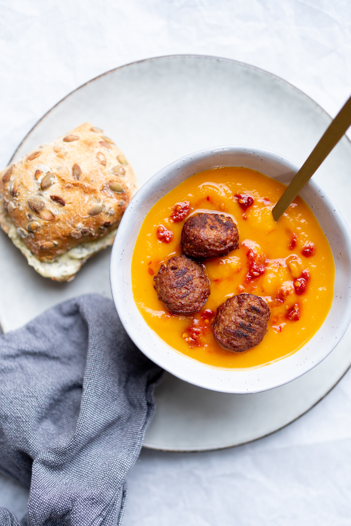 Pompoensoep met sambal en vegetarische Gehacktballetjes