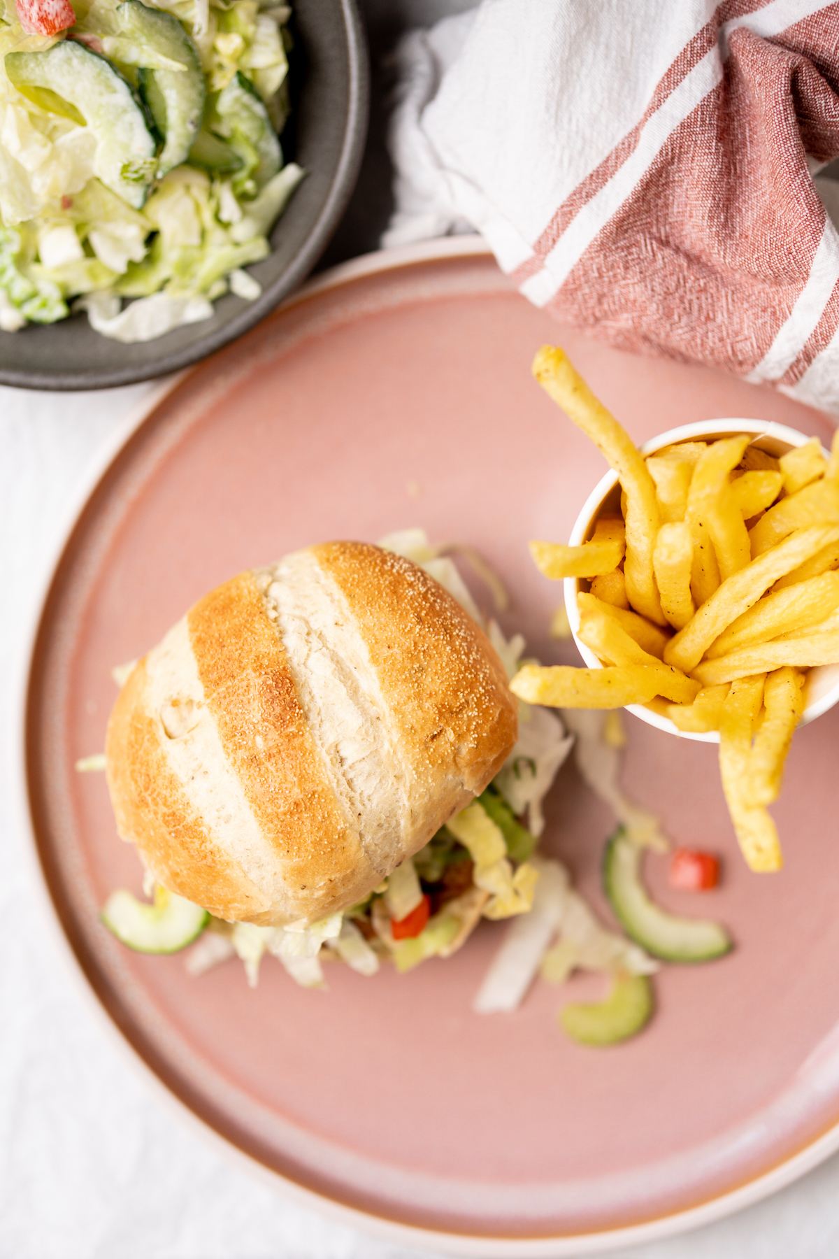 4. Snijd de broodjes open en besmeer de snijkanten met de rest van de mayonaise. Verdeel de rest van de sla, de burgers en de rest van de rauwkost erover en dek af met de bovenkant van de broodjes. Serveer met de salade en friet.