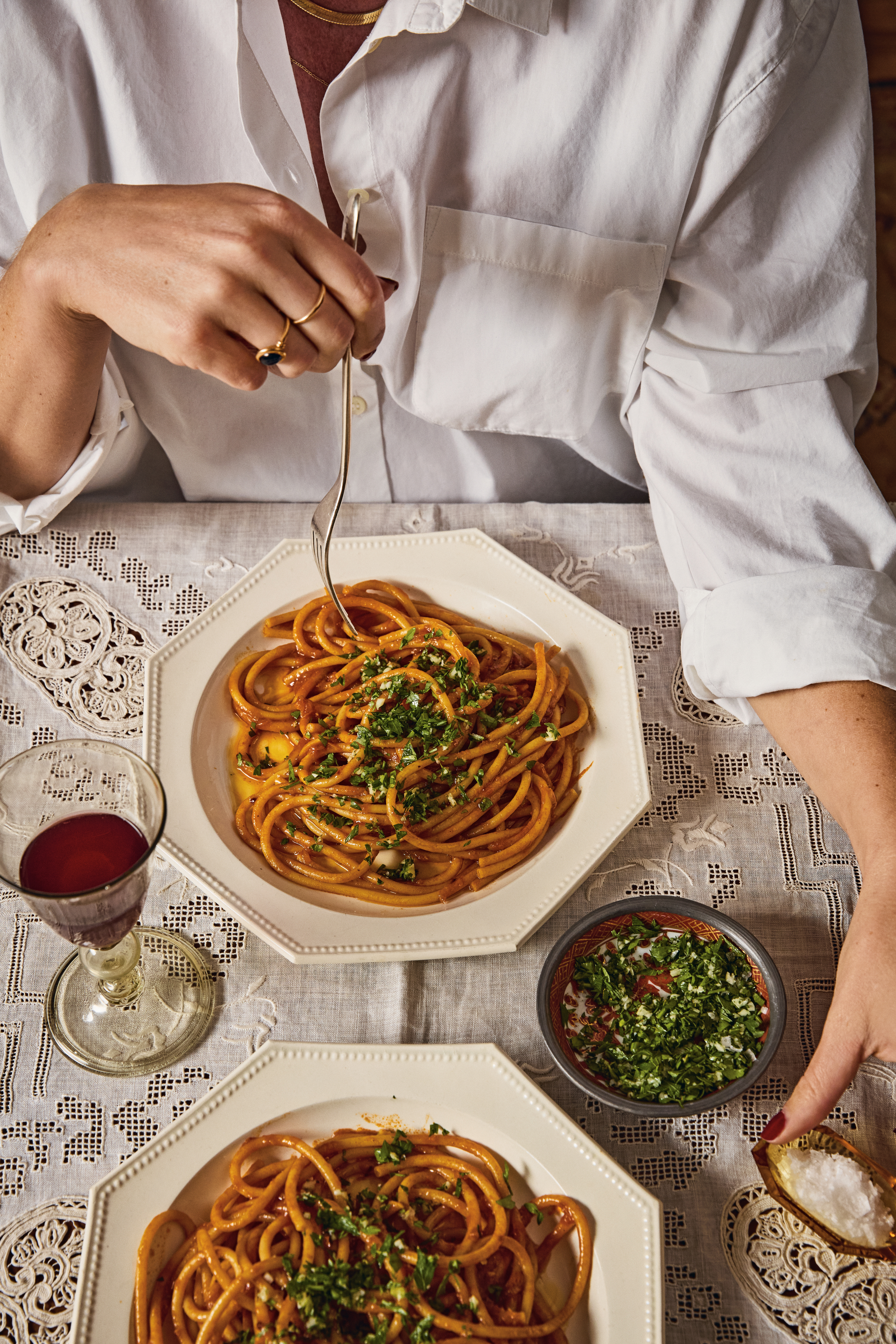 Alison Roman bedacht dit pastarecept in 2020 vlak voor de pandemie losbarstte. Noem het goede timing, want het werd dat jaar het best bekeken recept op de kookwebsite van The New York Times, waar Alison destijds columnist was. Koken uit de voorraadkast raakte toen natuurlijk helemaal in zwang, en aangezien je voor deze sjalottenpasta voornamelijk leunt op de ingrediënten sjalotten, ansjovis en tomatenpuree, was het direct een hit.