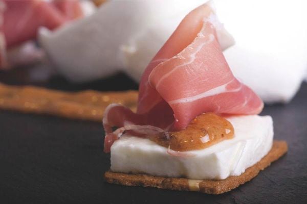Voor het opdienen beleg je de amandelkoekjes met verse mozzarella. De mozzarella besprenkel je met een streepje vijgenjam. Daarna voeg je nog een plakje droge Gandaham toe en je hapje is klaar om op te dienen!