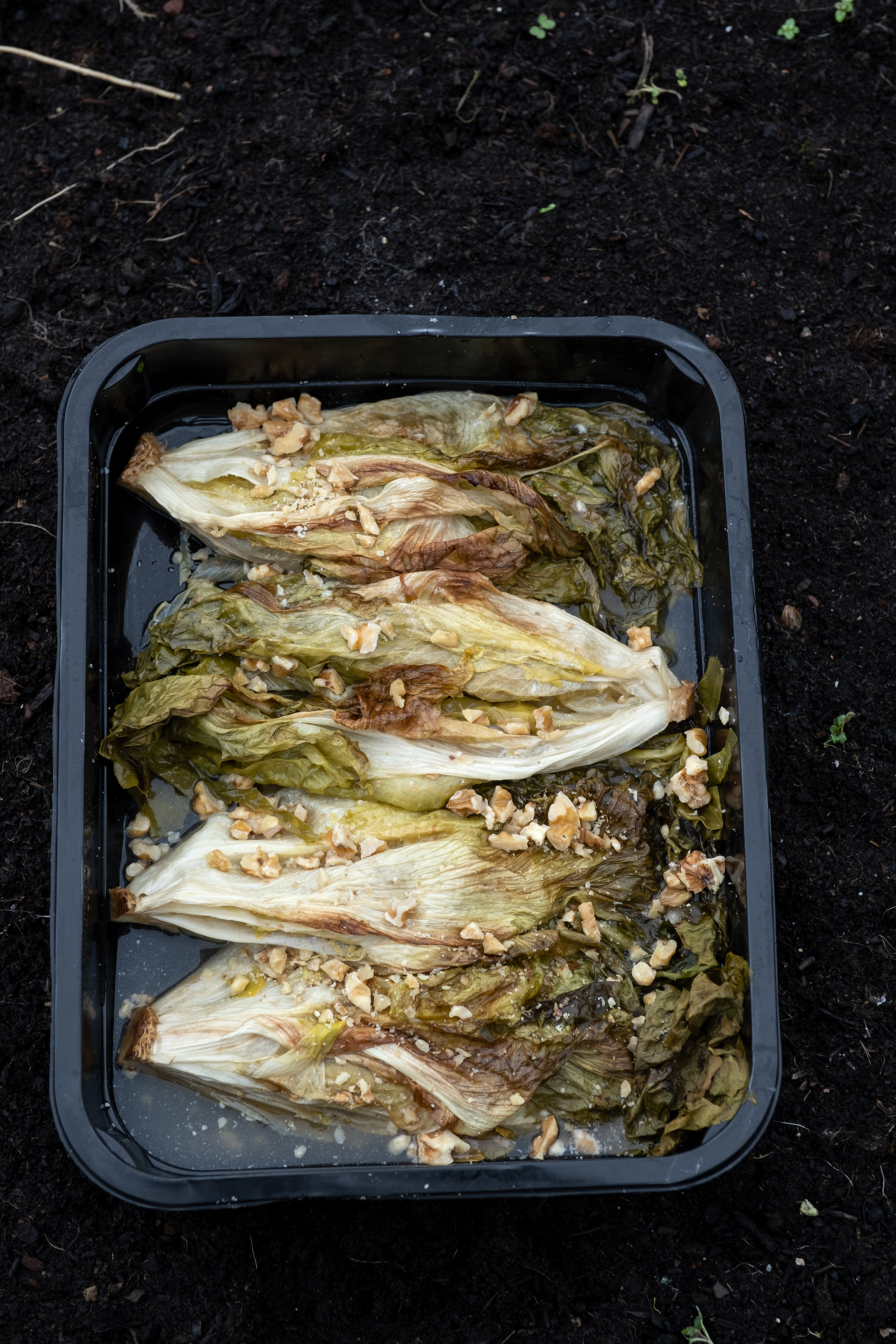 Haal de andijvie uit de oven en garneer met de walnoten en wat vocht uit de ovenschaal.