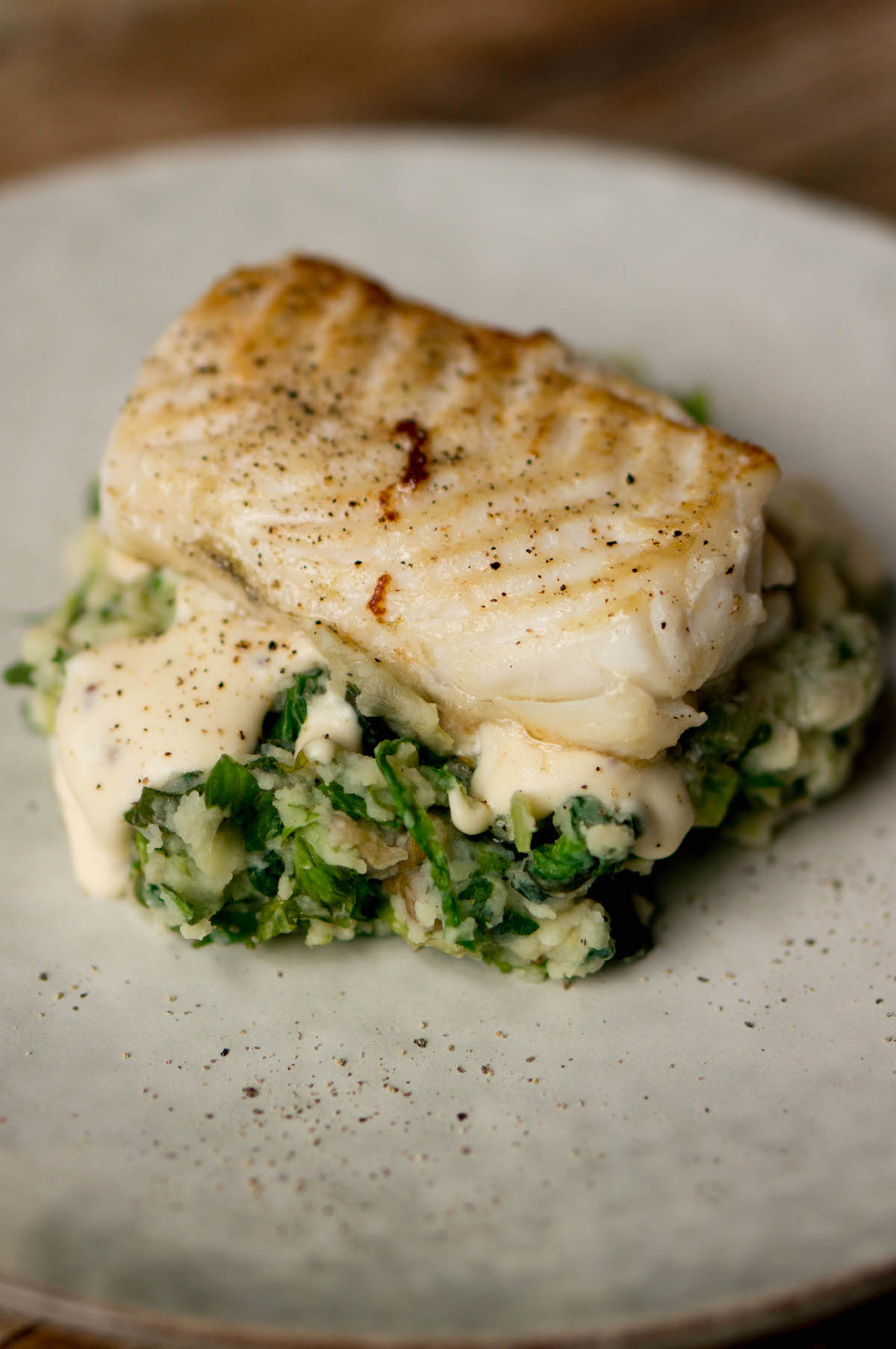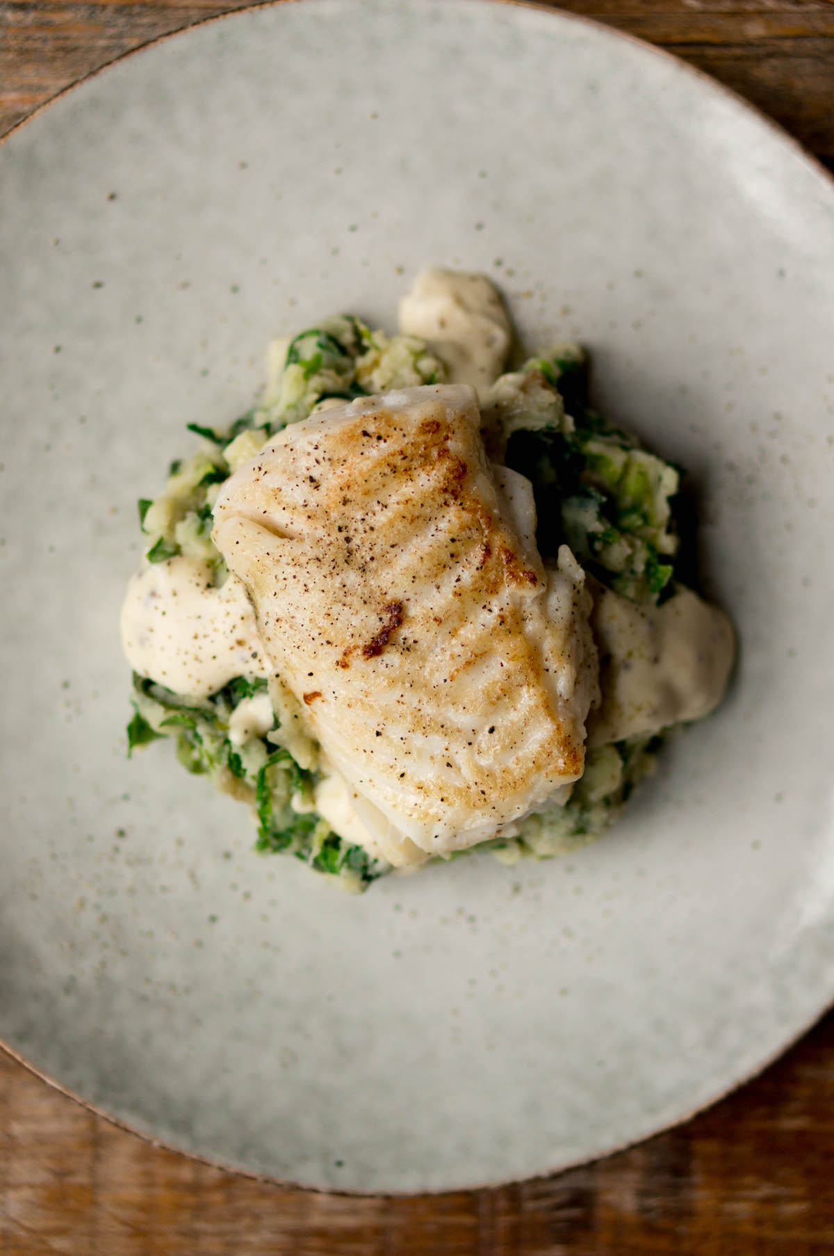 Schep een bergje andijviestamppot op de borden, giet er wat mosterdsaus overheen en leg er een stukje kabeljauw bovenop.