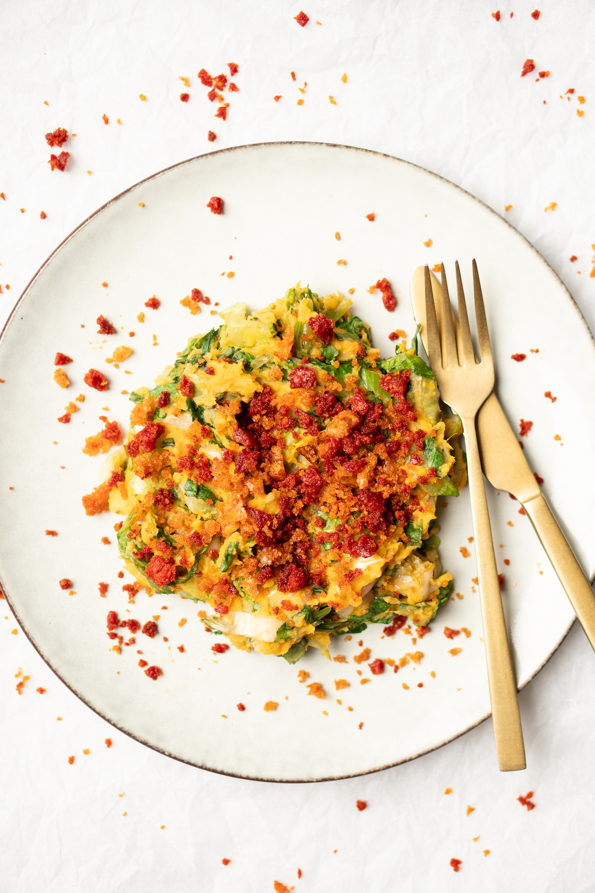 Schep op een bord en strooi het chorizo-broodkruim als confetti uit over de andijviestamppot.