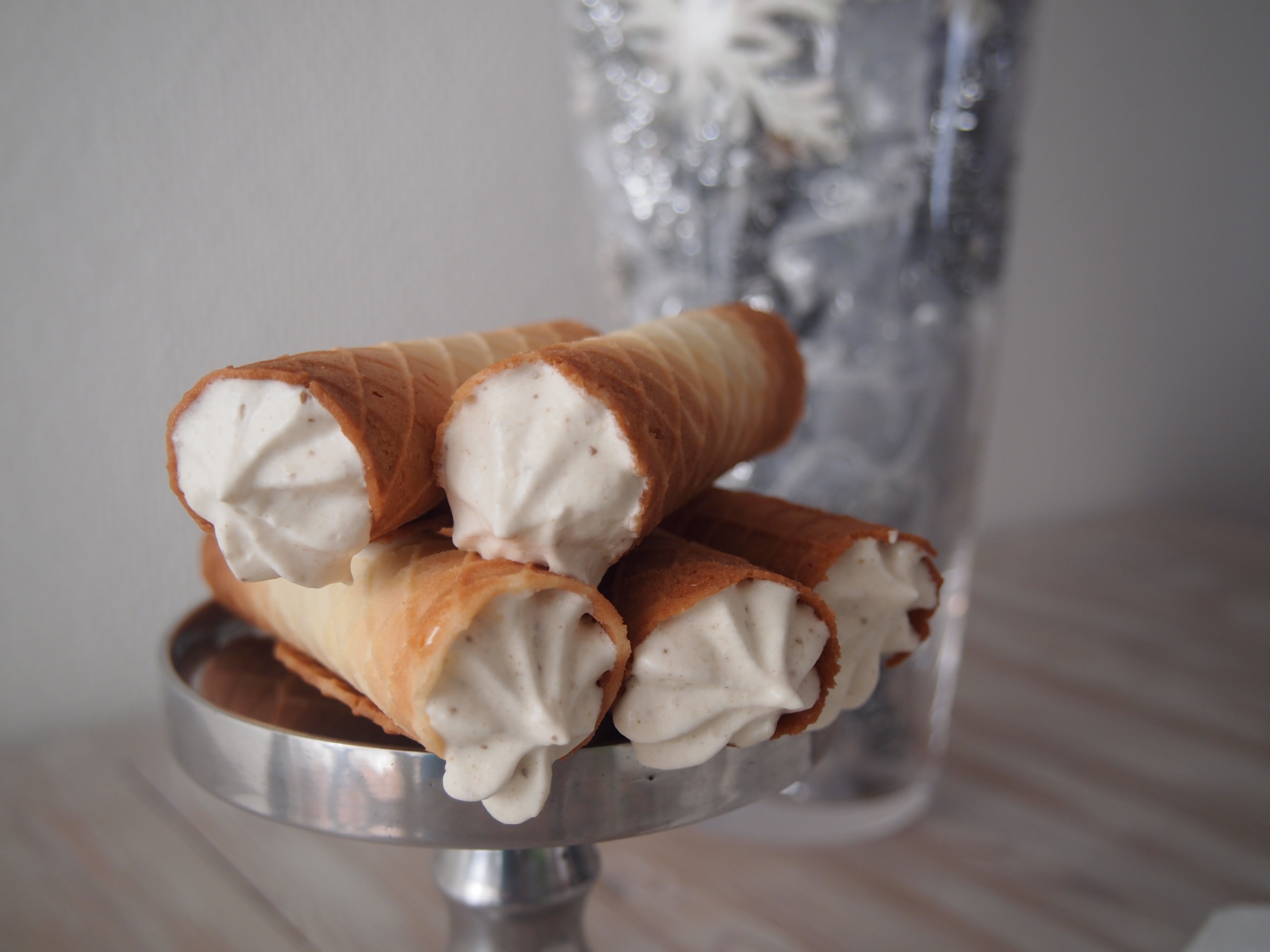 Klop de slagroom met de suiker op. Voeg tegen het einde het gemalen anijszaad toe. Doe de slagroom in een spuitzak met gekarteld spuitmondje en vul de rolletjes aan beide kanten met de slagroom. Vul de rolletjes niet te ver van tevoren, anders verliezen ze hun knapperigheid.