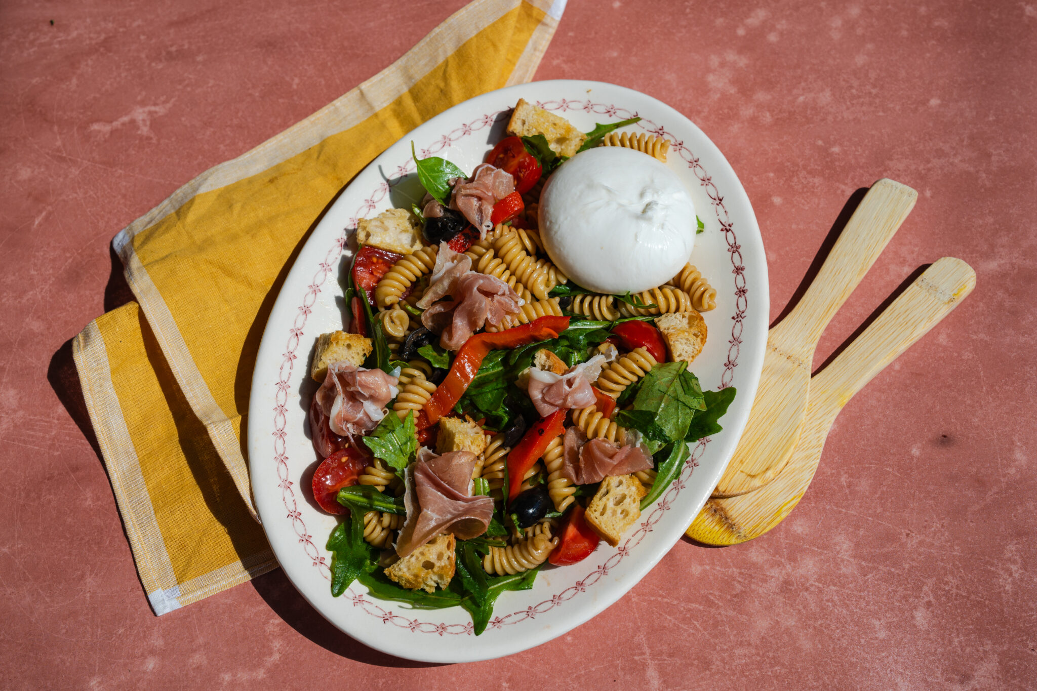 Zomerse antipasti-pastasalade met burrata, parmaham en olijven