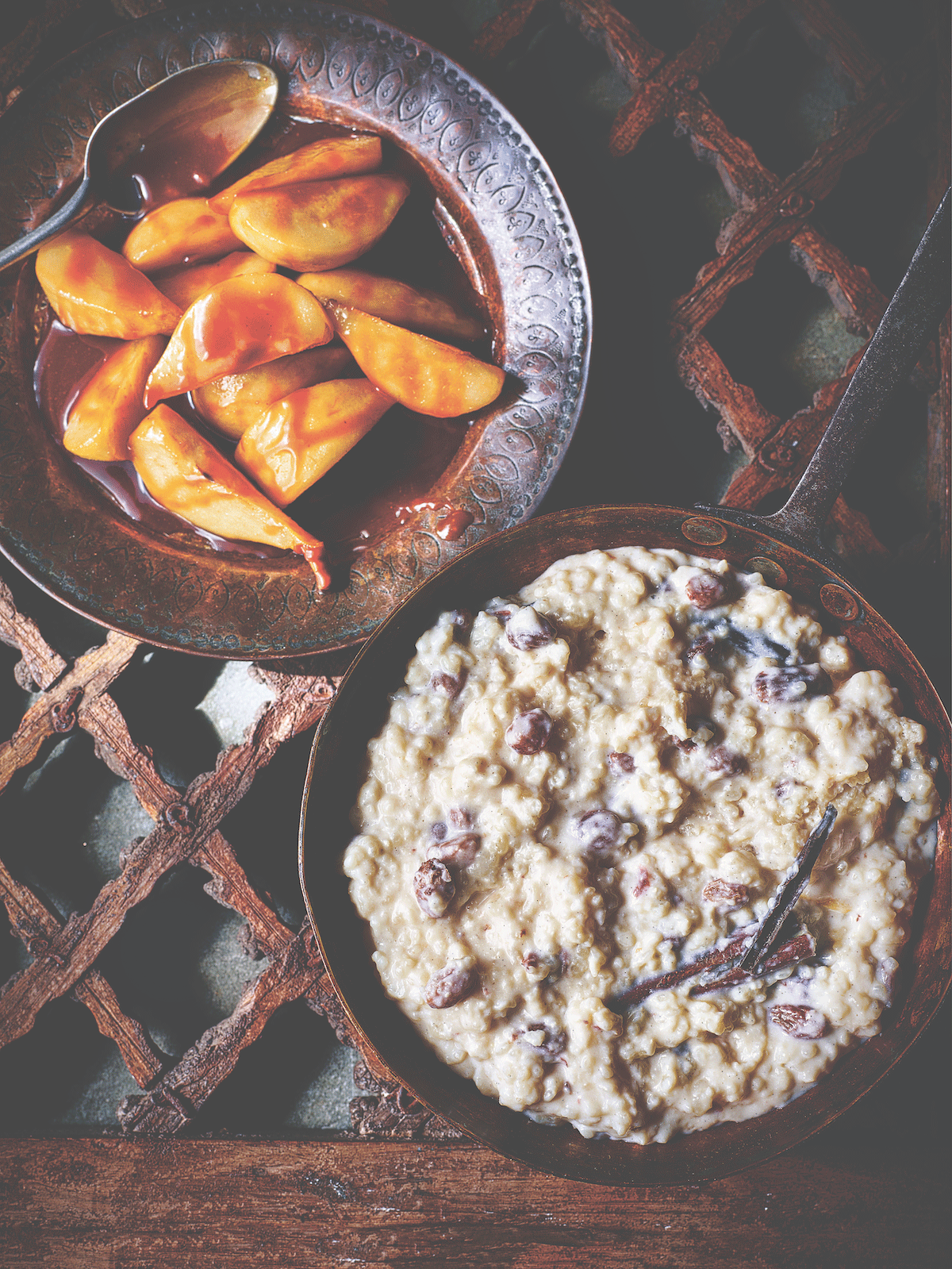 Arroz con leche met peer in zoute karamel en rozijnen uit Moors