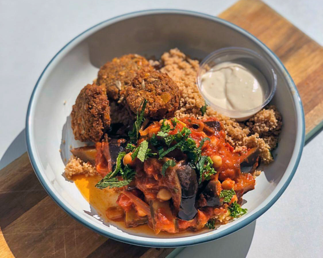 Hartstikke lekker met een salade van (spelt) couscous en falafel.