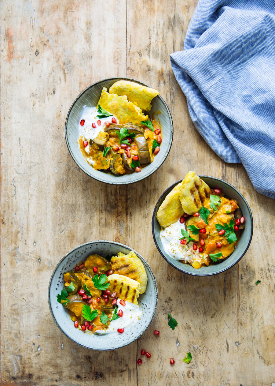 Schep de auberginecurry in kommen, bestrooi met de granaatappel en serveer er het flatbread, de yoghurt en eventueel verse kruiden bij.